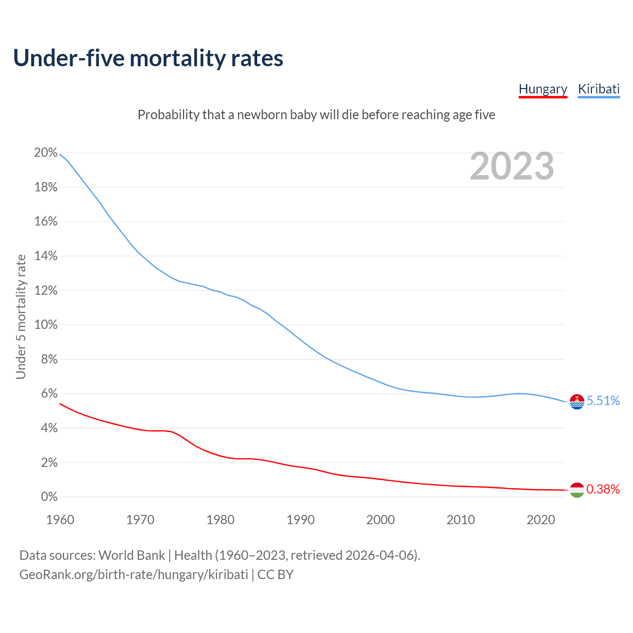 The chance that a newborn baby will die before reaching age five is 0.38% in Hungary and 5.51% in Kiribati. Above is a chart with historical data on under-five mortality rates.