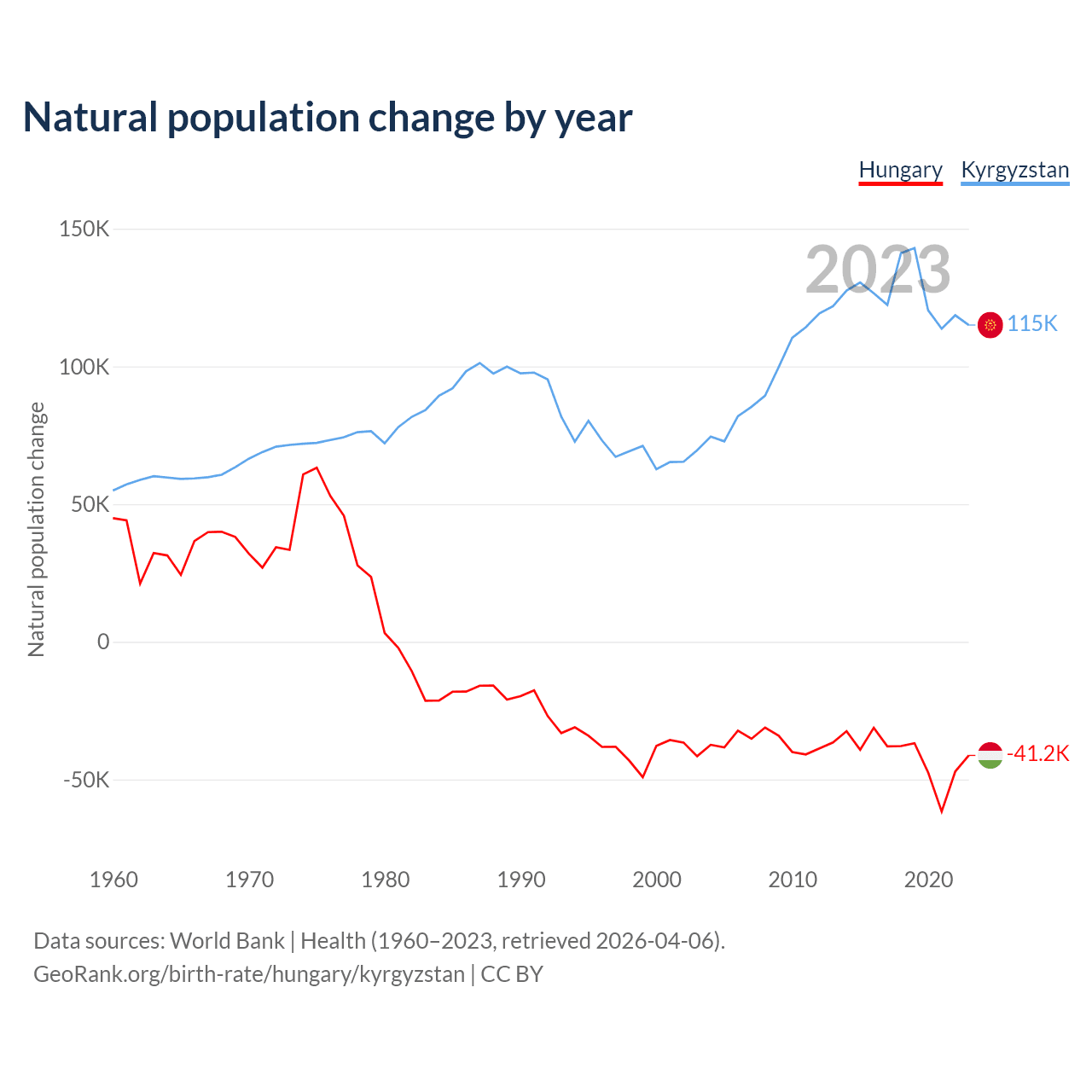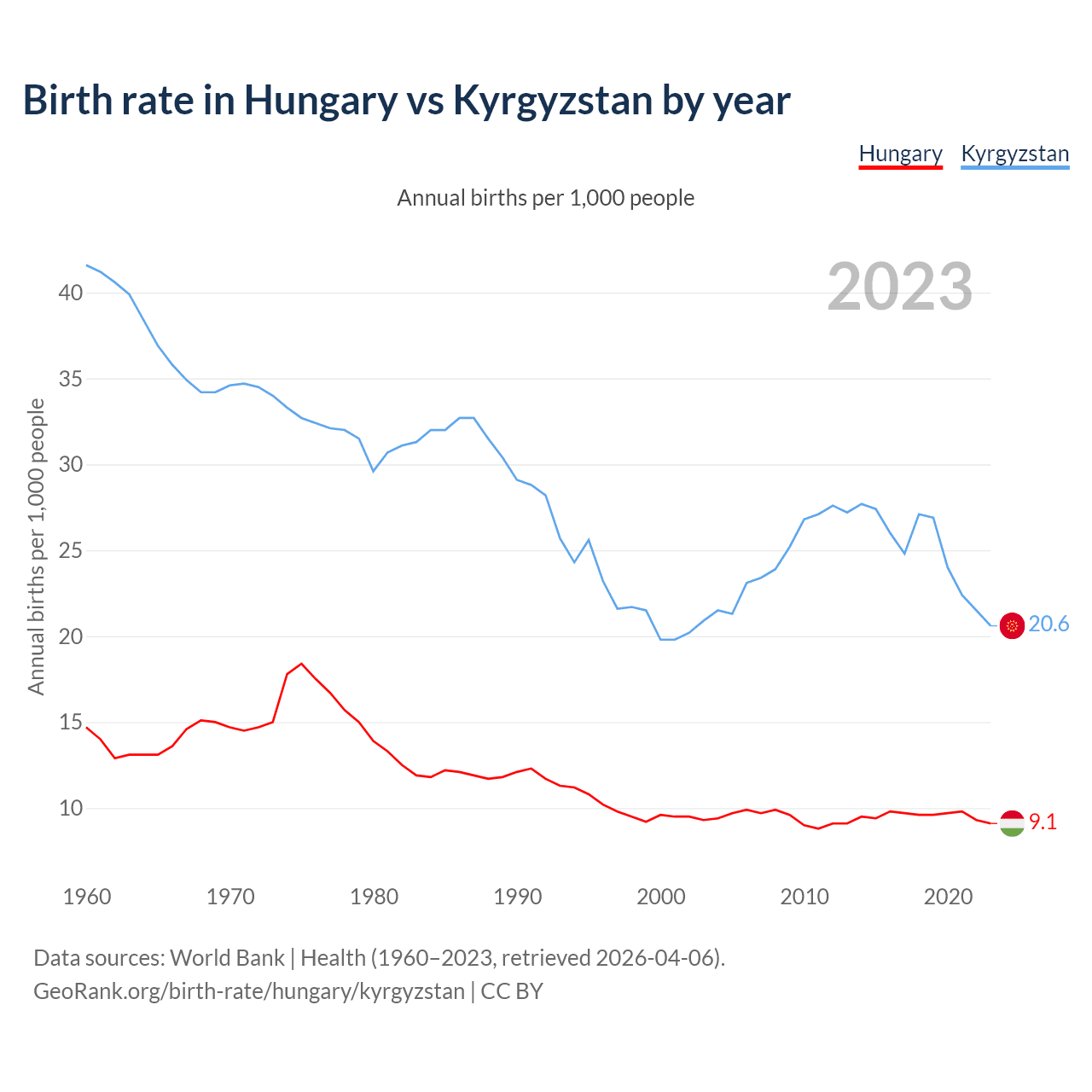 According to the latest available data on birth rates, the fertility rate in Hungary was 1.51 children per woman in 2023, compared to 2.7 in Kyrgyzstan in 2023. The replacement level is considered to be 2.1 children per woman.