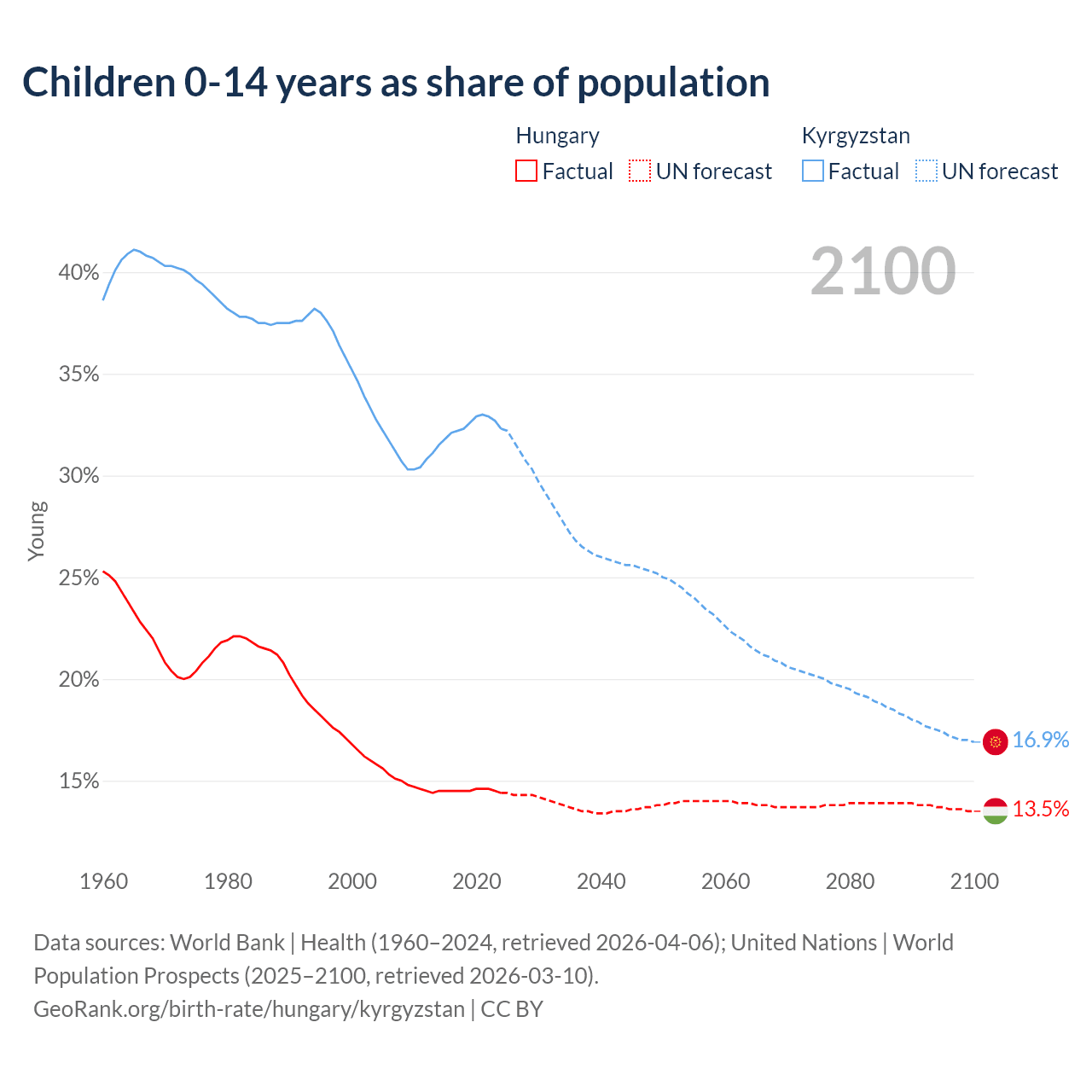 Hungary has an annual birth rate of 9.1 births per 1,000 people, compared to 20.6 for Kyrgyzstan. The average number of children a woman is expected to have during her lifetime — the fertility rate, is 1.51 in Hungary and 2.7 in Kyrgyzstan — 78.8% difference.