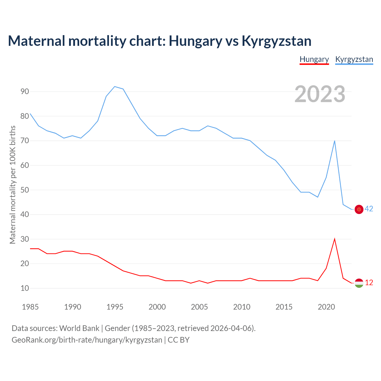 The maternal mortality rate, which is the probability of dying during childbirth or within 42 days of pregnancy termination, is 12 deaths per 100,000 live births in Hungary, compared to 42 deaths in Kyrgyzstan.