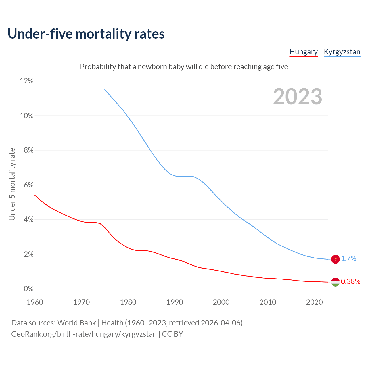 The chance that a newborn baby will die before reaching age five is 0.38% in Hungary and 1.7% in Kyrgyzstan. Above is a chart with historical data on under-five mortality rates.
