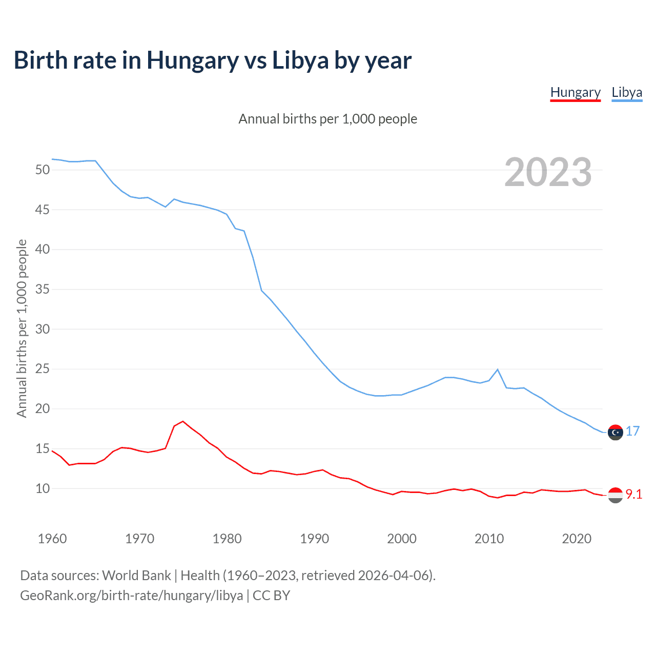Hungary has an annual birth rate of 9.1 births per 1,000 people, compared to 17 for Libya. The average number of children a woman is expected to have during her lifetime — the fertility rate, is 1.51 in Hungary and 2.36 in Libya — 56% difference.