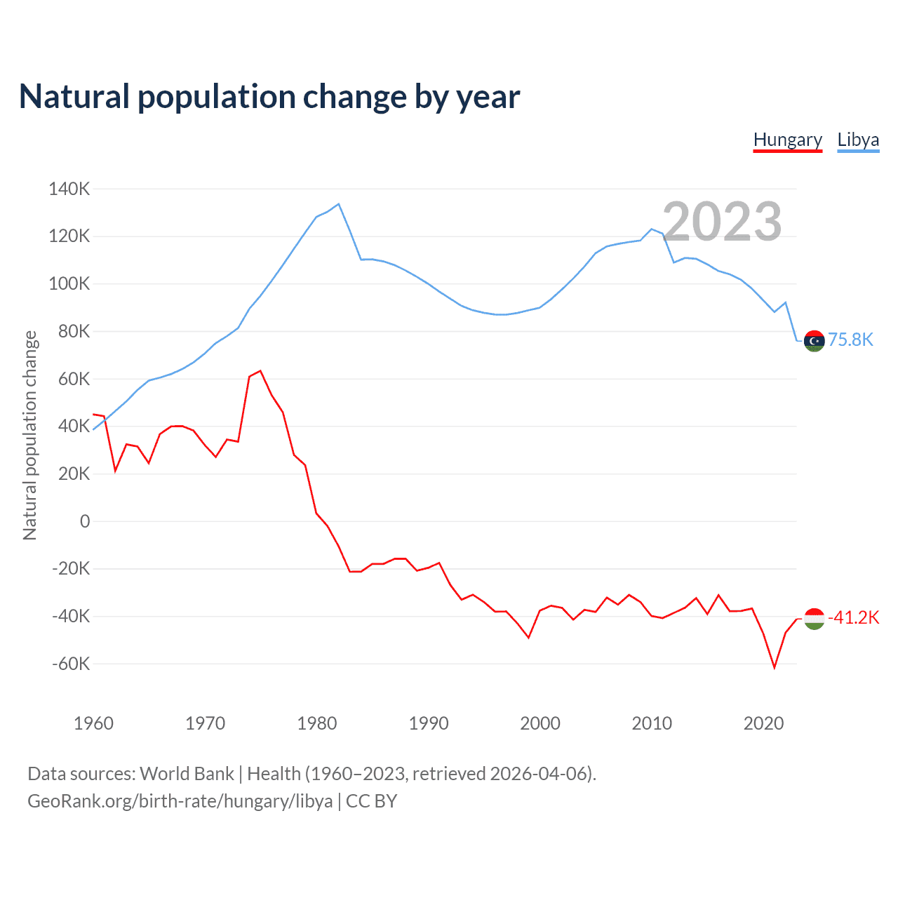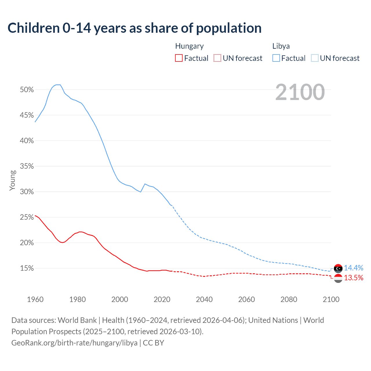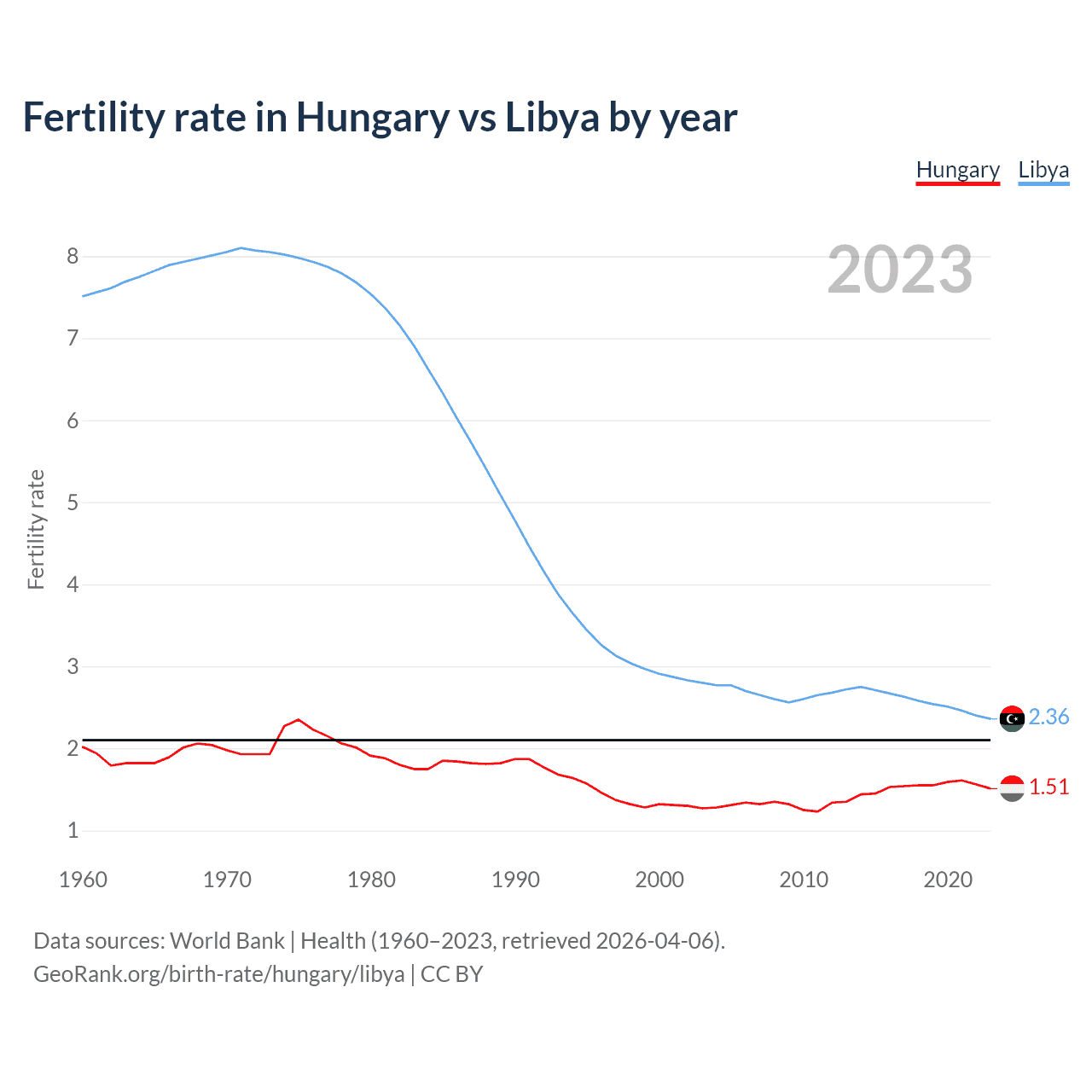 According to the latest available data on birth rates, the fertility rate in Hungary was 1.51 children per woman in 2023, compared to 2.36 in Libya in 2023. The replacement level is considered to be 2.1 children per woman.