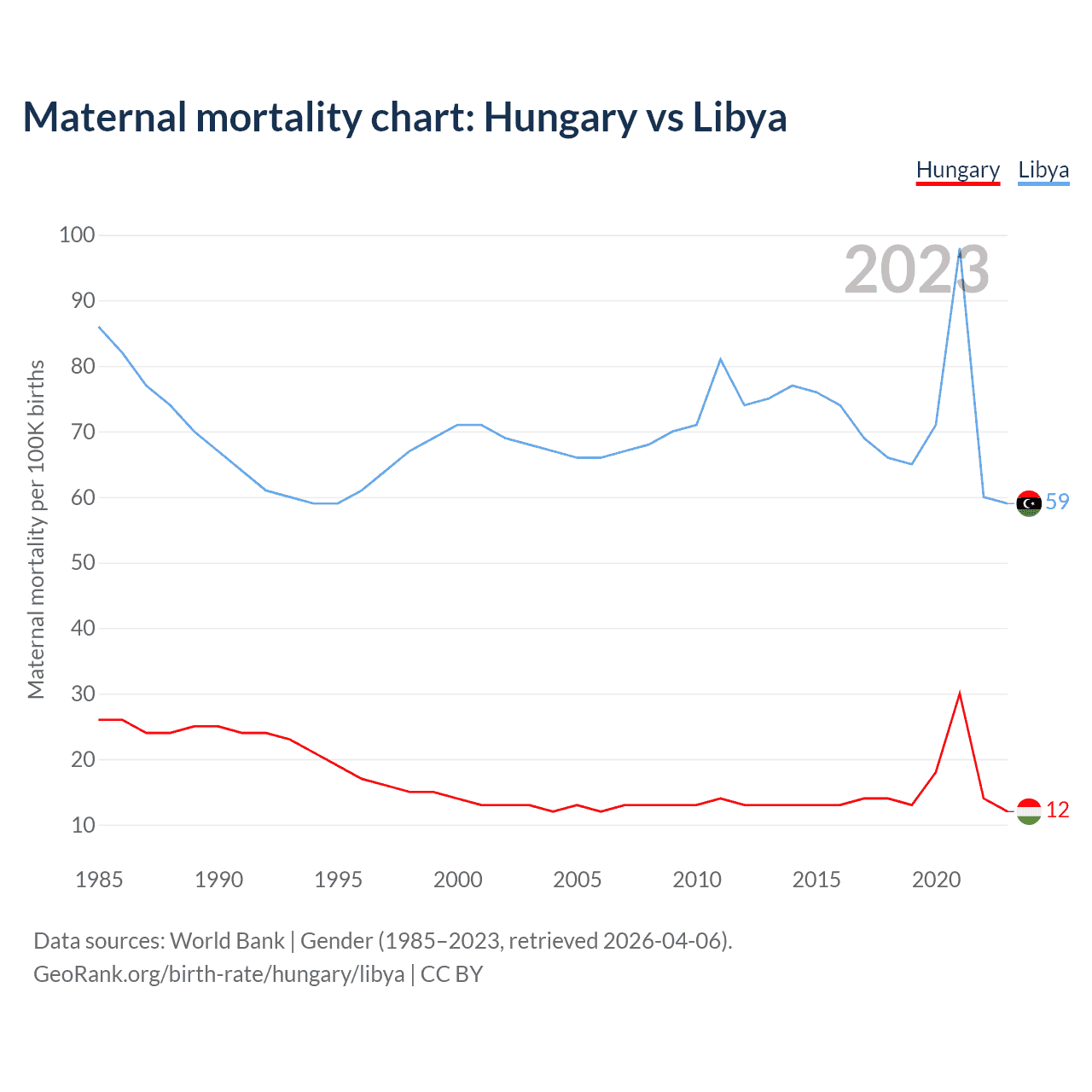 The maternal mortality rate, which is the probability of dying during childbirth or within 42 days of pregnancy termination, is 12 deaths per 100,000 live births in Hungary, compared to 59 deaths in Libya.