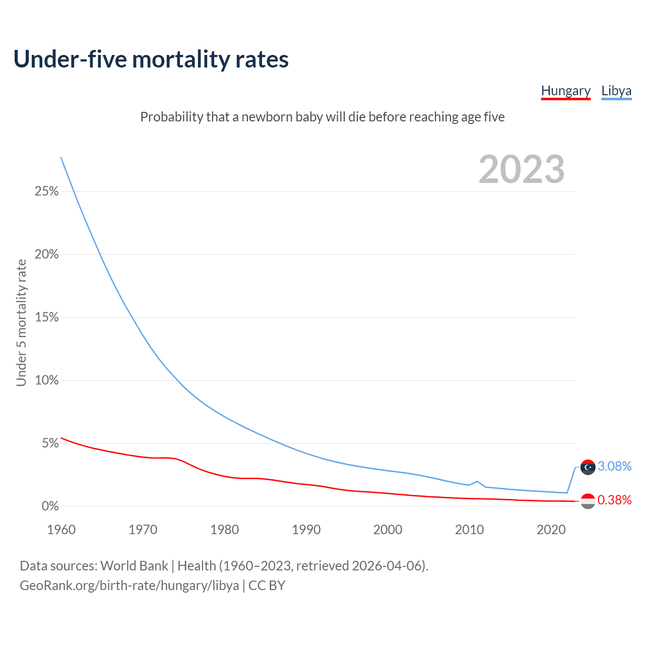 The chance that a newborn baby will die before reaching age five is 0.38% in Hungary and 3.08% in Libya. Above is a chart with historical data on under-five mortality rates.