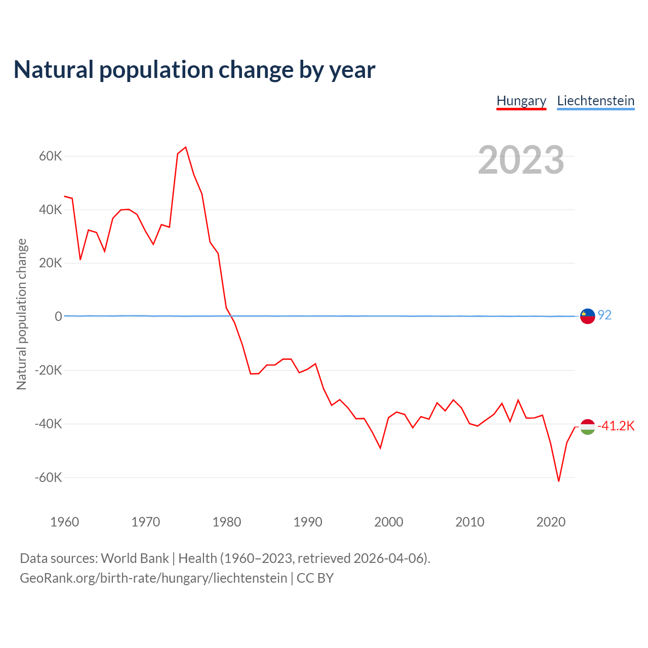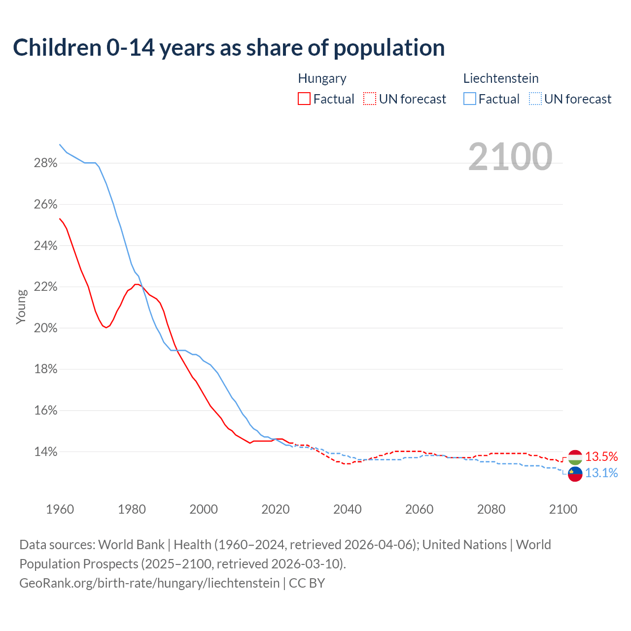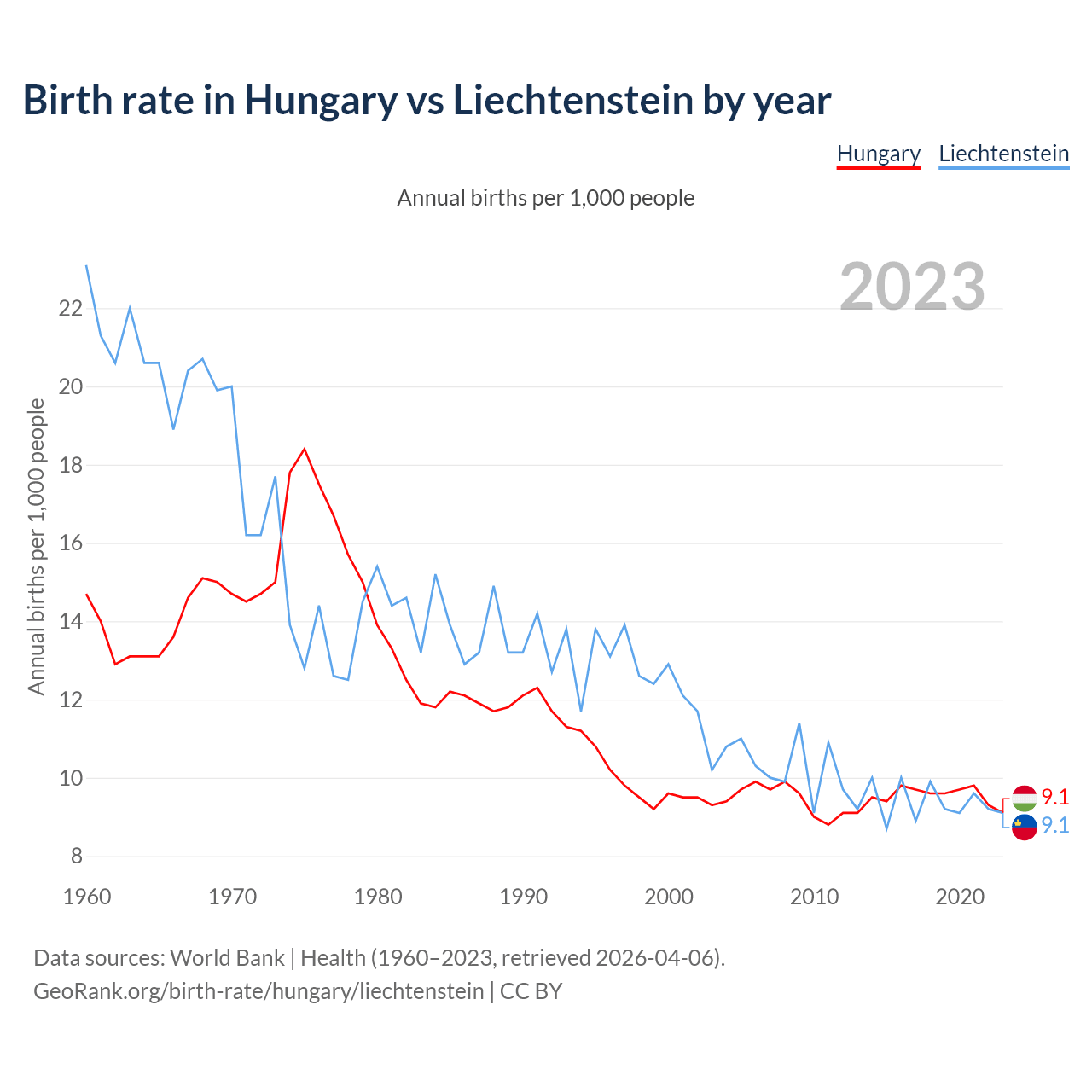 According to the latest available data on birth rates, the fertility rate in Hungary was 1.51 children per woman in 2023, compared to 1.45 in Liechtenstein in 2023. The replacement level is considered to be 2.1 children per woman.