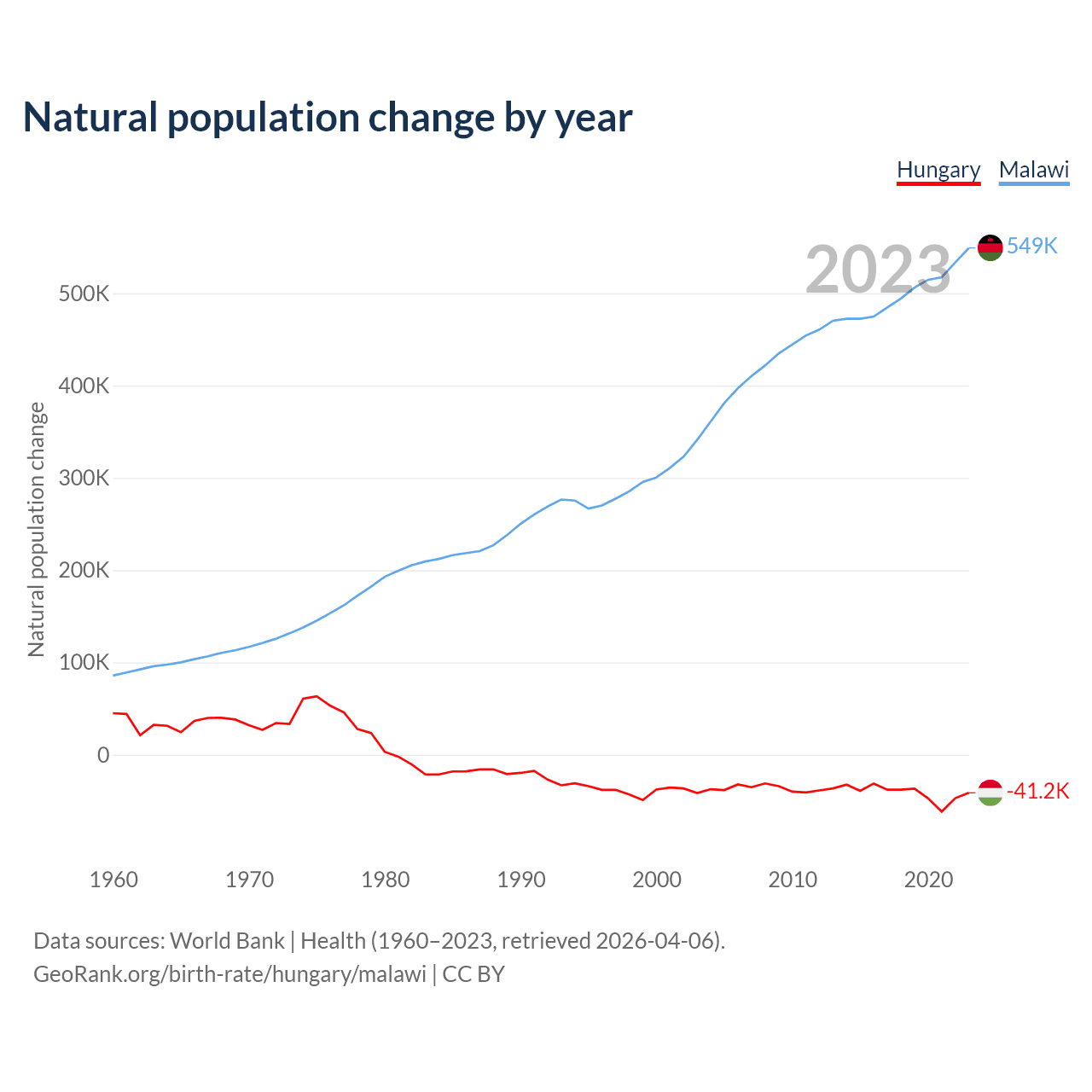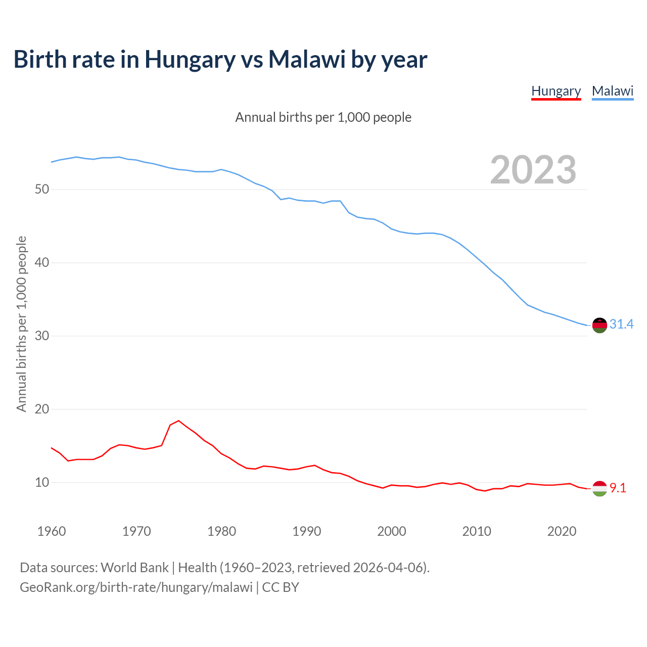 Hungary has an annual birth rate of 9.1 births per 1,000 people, compared to 31.4 for Malawi. The average number of children a woman is expected to have during her lifetime — the fertility rate, is 1.51 in Hungary and 3.65 in Malawi — 141.6% difference.