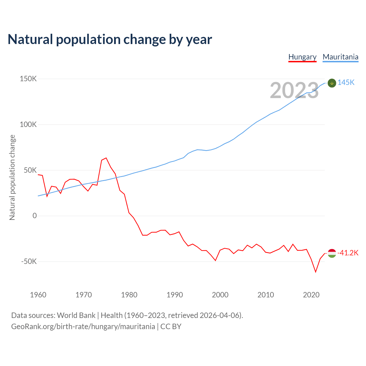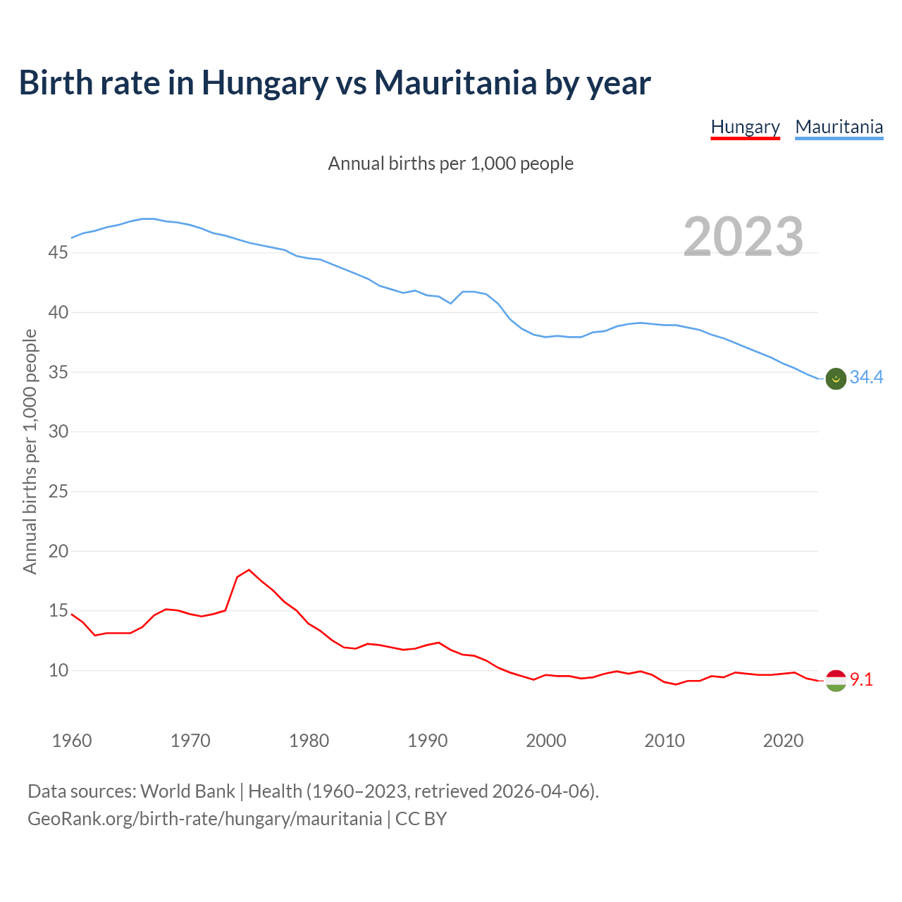 Hungary has an annual birth rate of 9.1 births per 1,000 people, compared to 34.4 for Mauritania. The average number of children a woman is expected to have during her lifetime — the fertility rate, is 1.51 in Hungary and 4.7 in Mauritania — 211.1% difference.