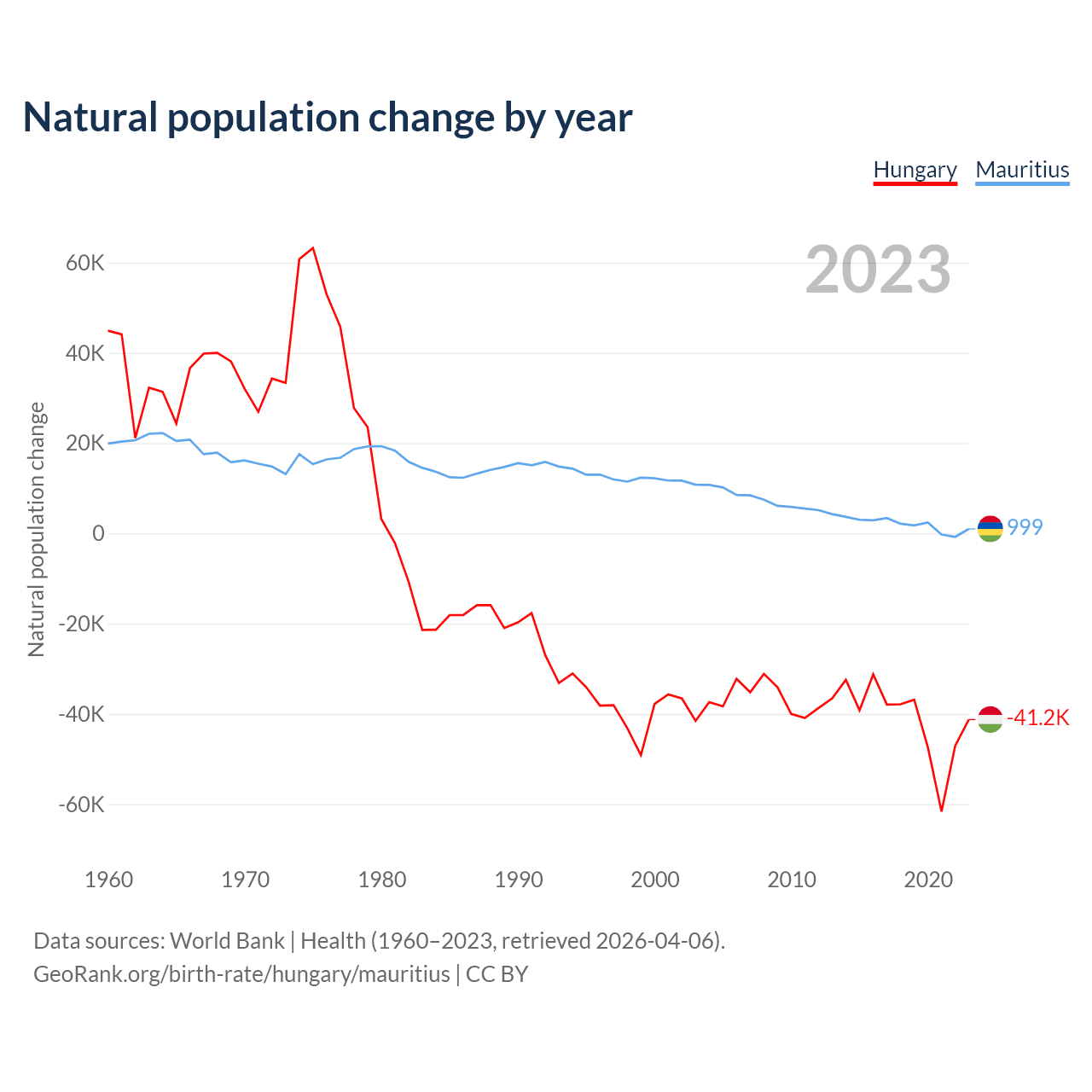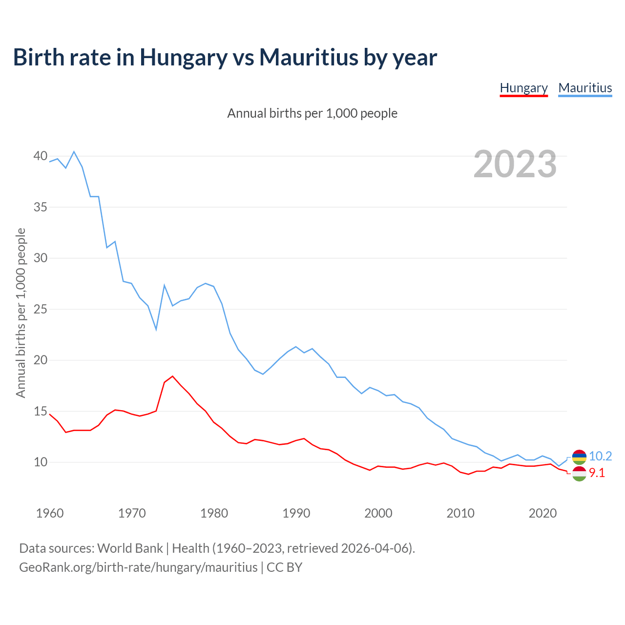 According to the latest available data on birth rates, the fertility rate in Hungary was 1.51 children per woman in 2023, compared to 1.39 in Mauritius in 2023. The replacement level is considered to be 2.1 children per woman.