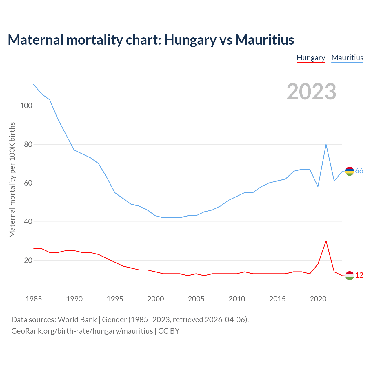 The maternal mortality rate, which is the probability of dying during childbirth or within 42 days of pregnancy termination, is 12 deaths per 100,000 live births in Hungary, compared to 66 deaths in Mauritius.