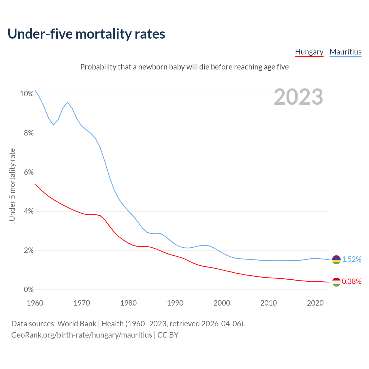 The chance that a newborn baby will die before reaching age five is 0.38% in Hungary and 1.52% in Mauritius. Above is a chart with historical data on under-five mortality rates.