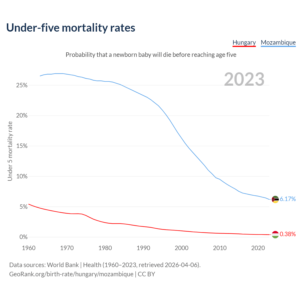 The chance that a newborn baby will die before reaching age five is 0.38% in Hungary and 6.17% in Mozambique. Above is a chart with historical data on under-five mortality rates.