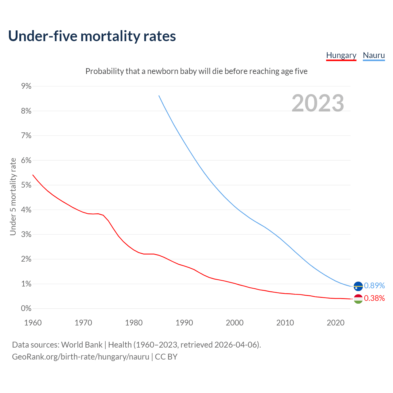 The chance that a newborn baby will die before reaching age five is 0.38% in Hungary and 0.89% in Nauru. Above is a chart with historical data on under-five mortality rates.