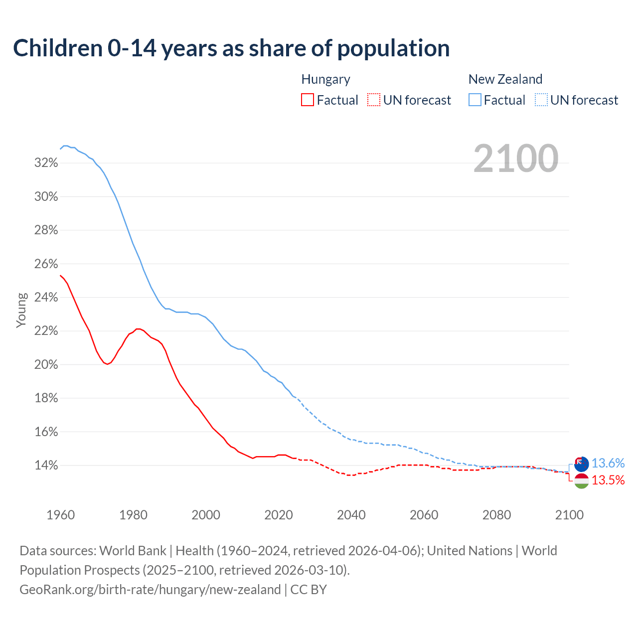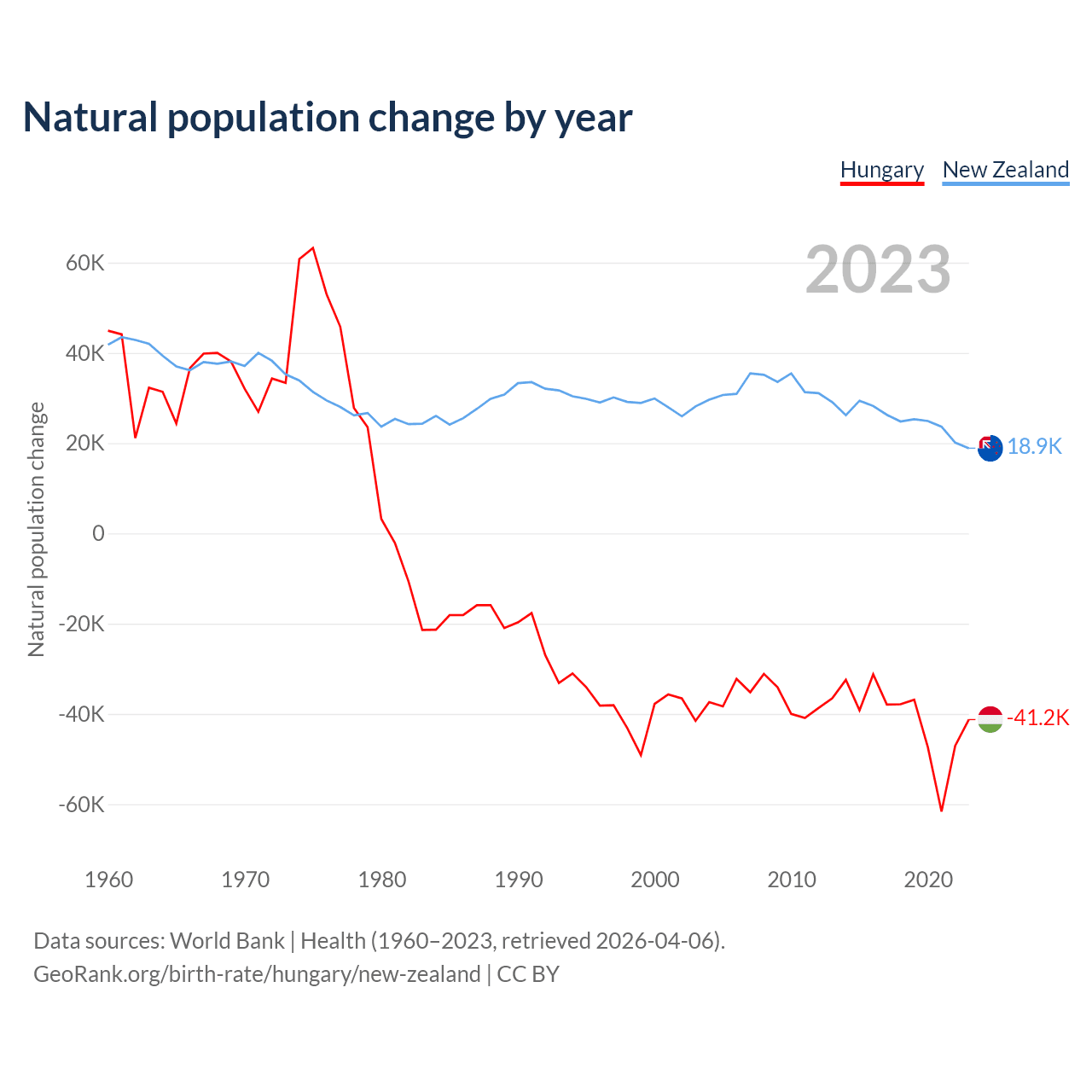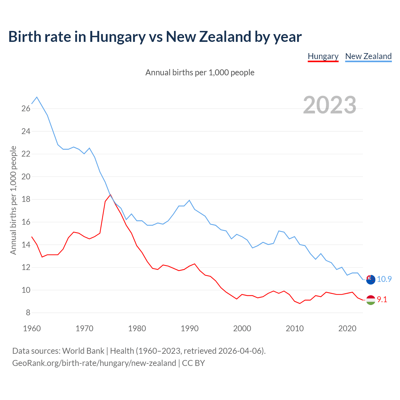 According to the latest available data on birth rates, the fertility rate in Hungary was 1.51 children per woman in 2023, compared to 1.56 in New Zealand in 2023. The replacement level is considered to be 2.1 children per woman.