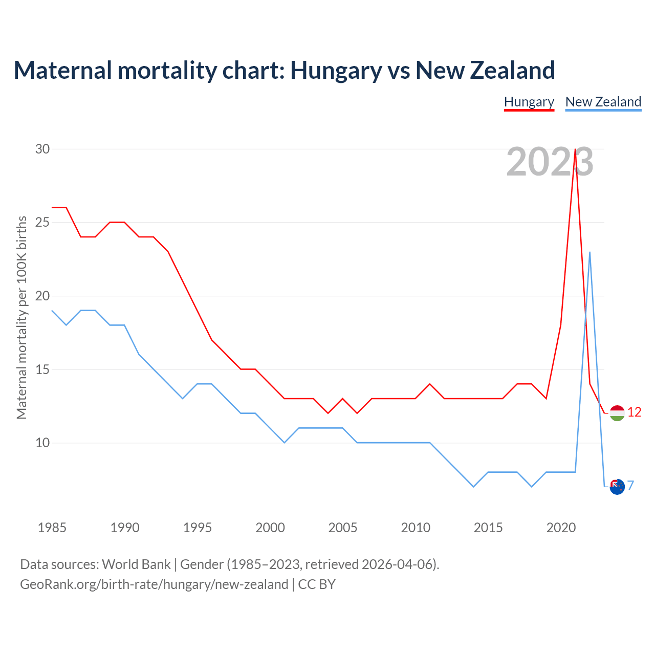 The maternal mortality rate, which is the probability of dying during childbirth or within 42 days of pregnancy termination, is 12 deaths per 100,000 live births in Hungary, compared to 7 deaths in New Zealand.