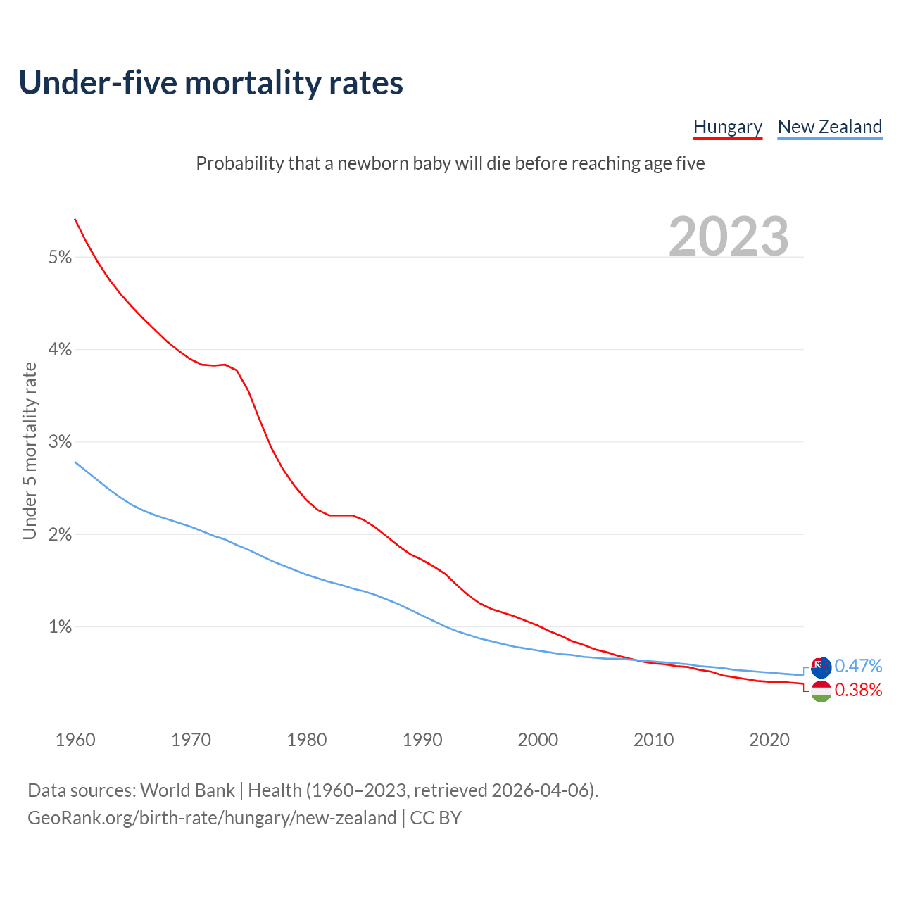 The chance that a newborn baby will die before reaching age five is 0.38% in Hungary and 0.47% in New Zealand. Above is a chart with historical data on under-five mortality rates.