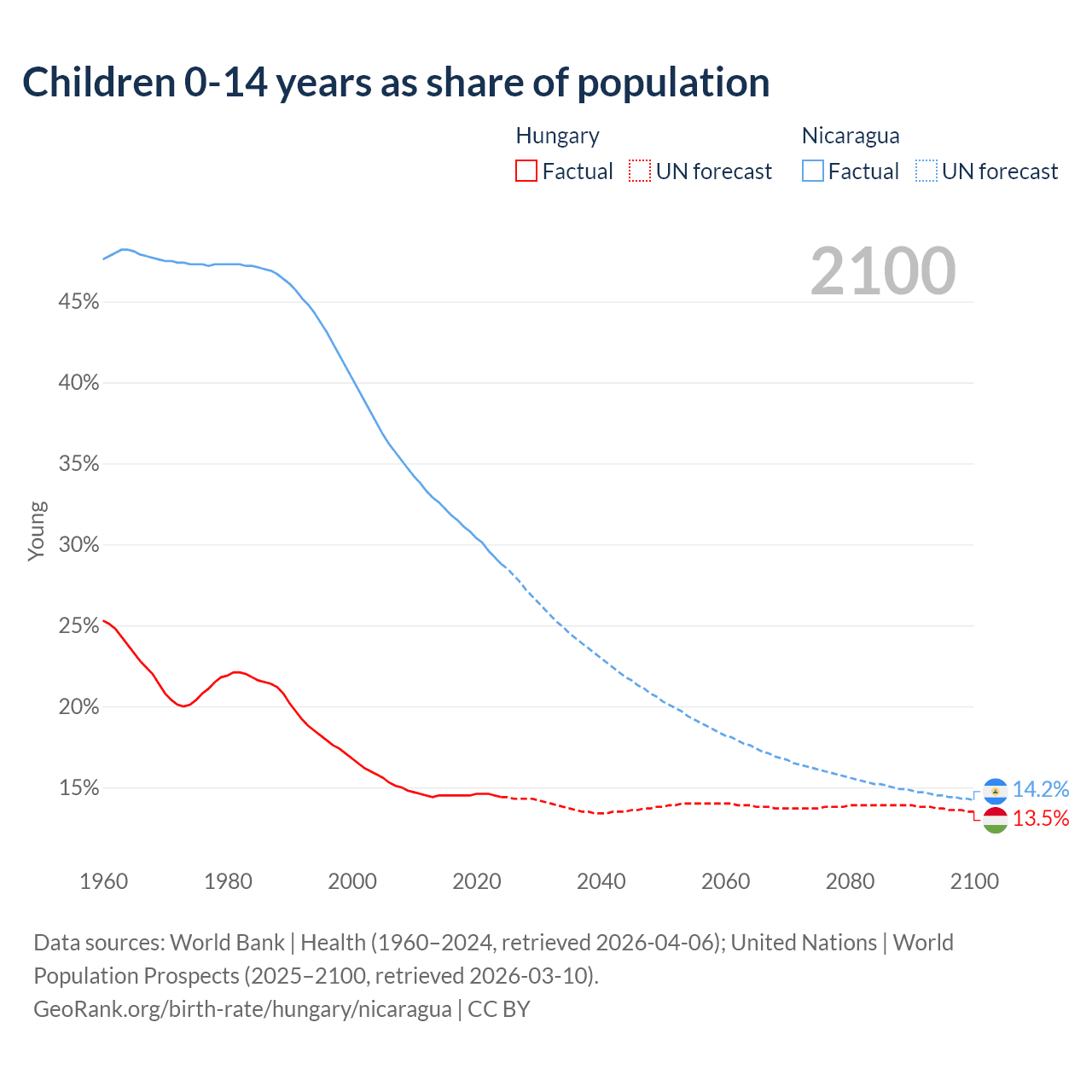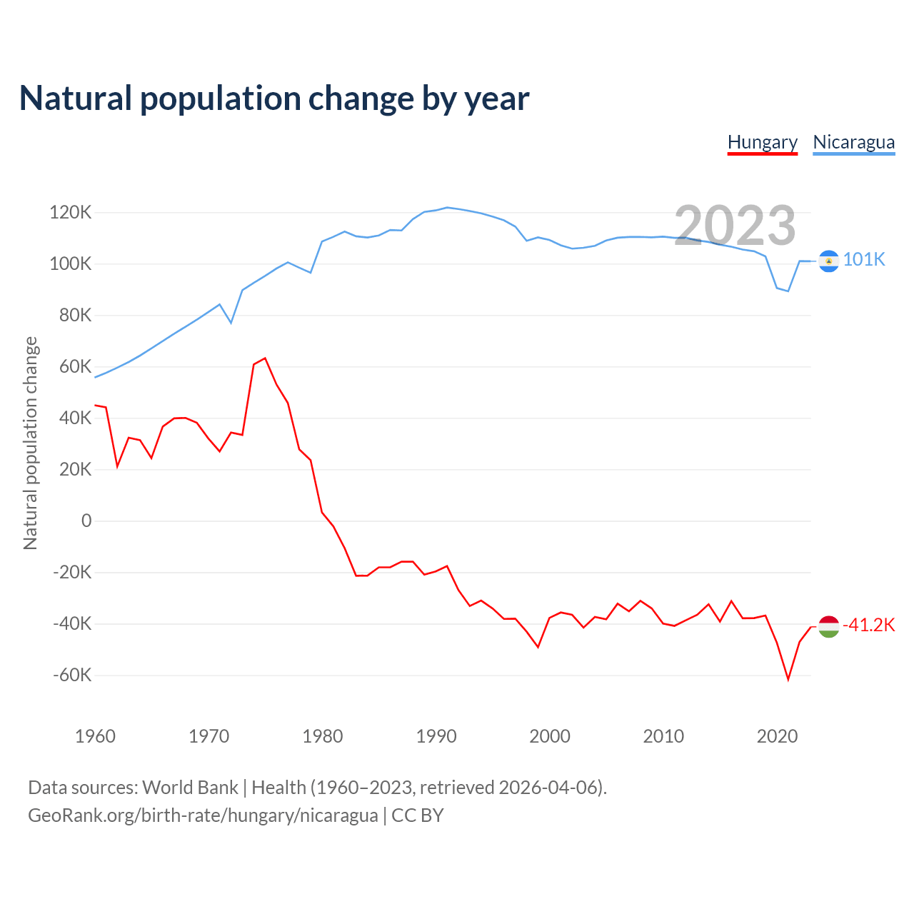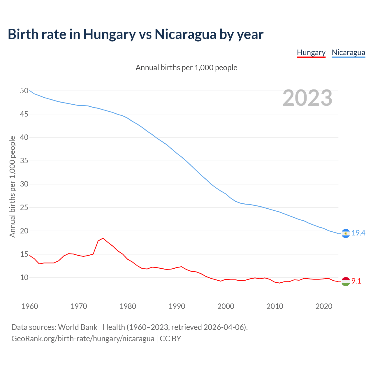 According to the latest available data on birth rates, the fertility rate in Hungary was 1.51 children per woman in 2023, compared to 2.22 in Nicaragua in 2023. The replacement level is considered to be 2.1 children per woman.