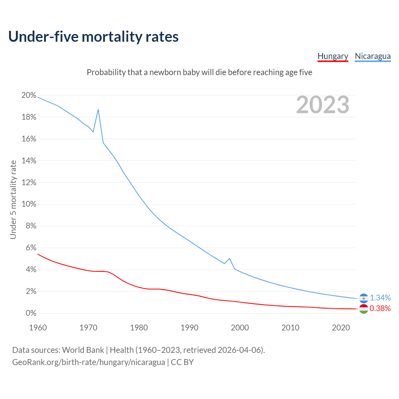 The chance that a newborn baby will die before reaching age five is 0.38% in Hungary and 1.34% in Nicaragua. Above is a chart with historical data on under-five mortality rates.