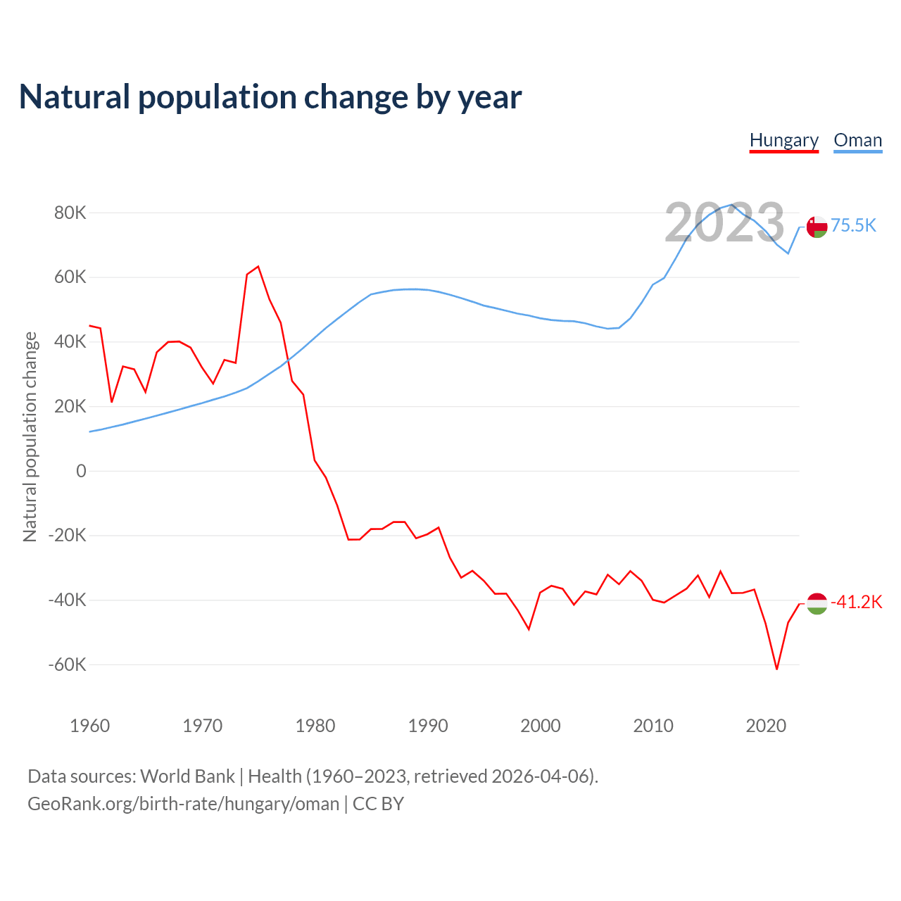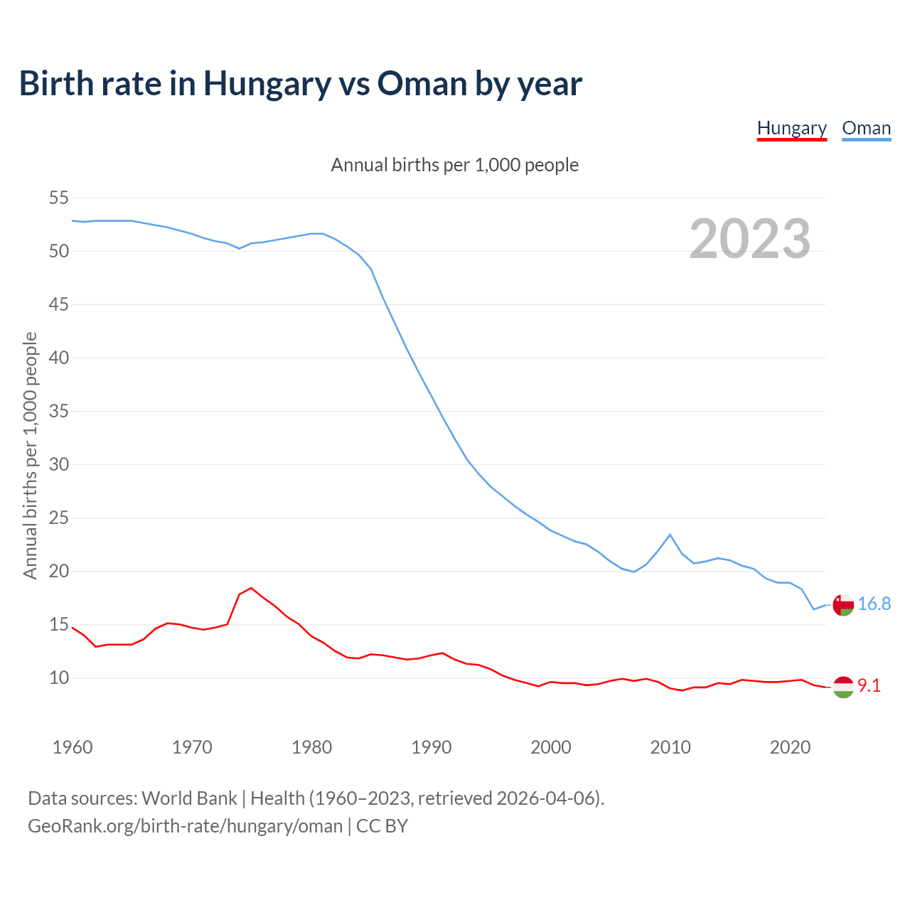 Hungary has an annual birth rate of 9.1 births per 1,000 people, compared to 16.8 for Oman. The average number of children a woman is expected to have during her lifetime — the fertility rate, is 1.51 in Hungary and 2.53 in Oman — 67.2% difference.