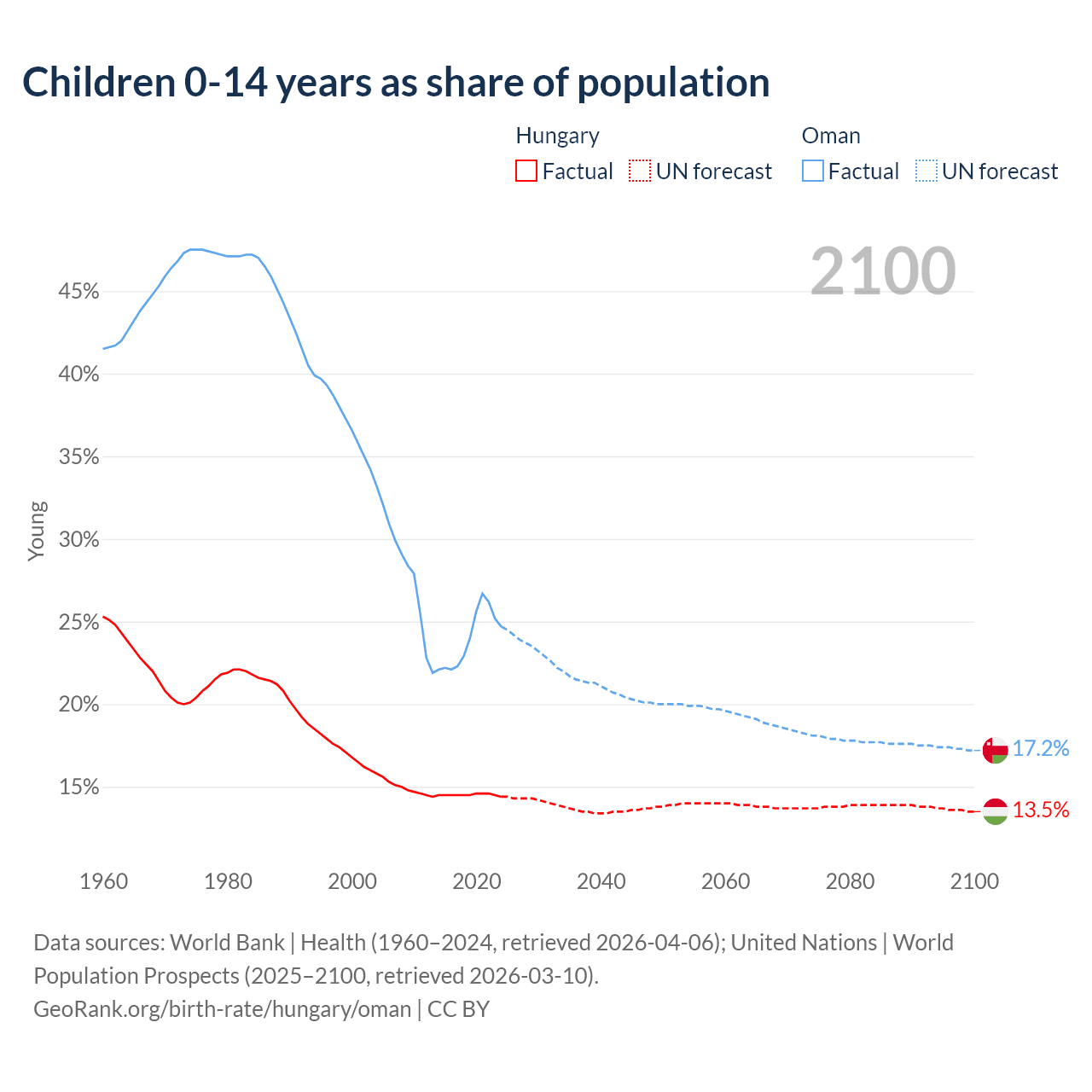 According to the latest available data on birth rates, the fertility rate in Hungary was 1.51 children per woman in 2023, compared to 2.53 in Oman in 2023. The replacement level is considered to be 2.1 children per woman.