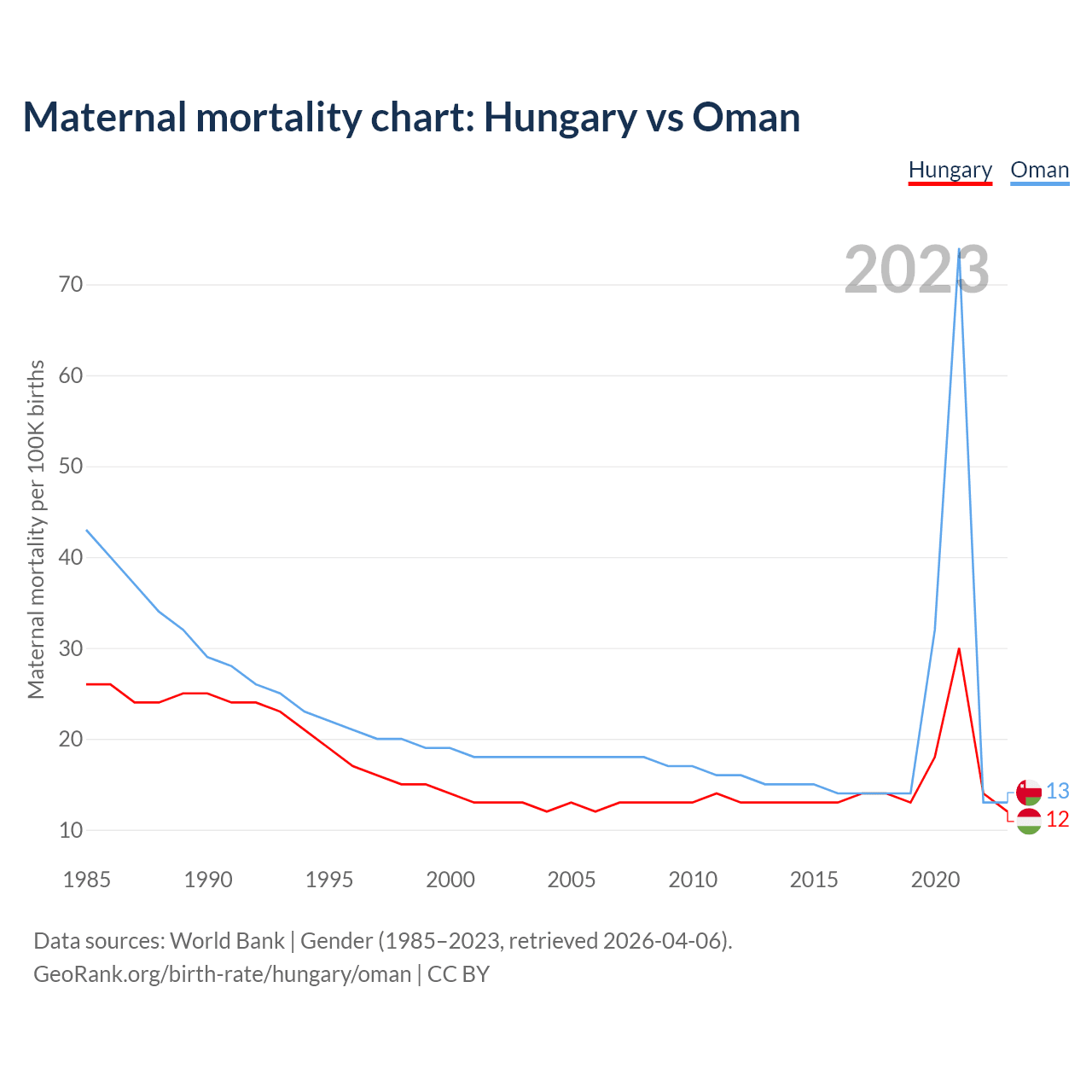 The maternal mortality rate, which is the probability of dying during childbirth or within 42 days of pregnancy termination, is 12 deaths per 100,000 live births in Hungary, compared to 13 deaths in Oman.