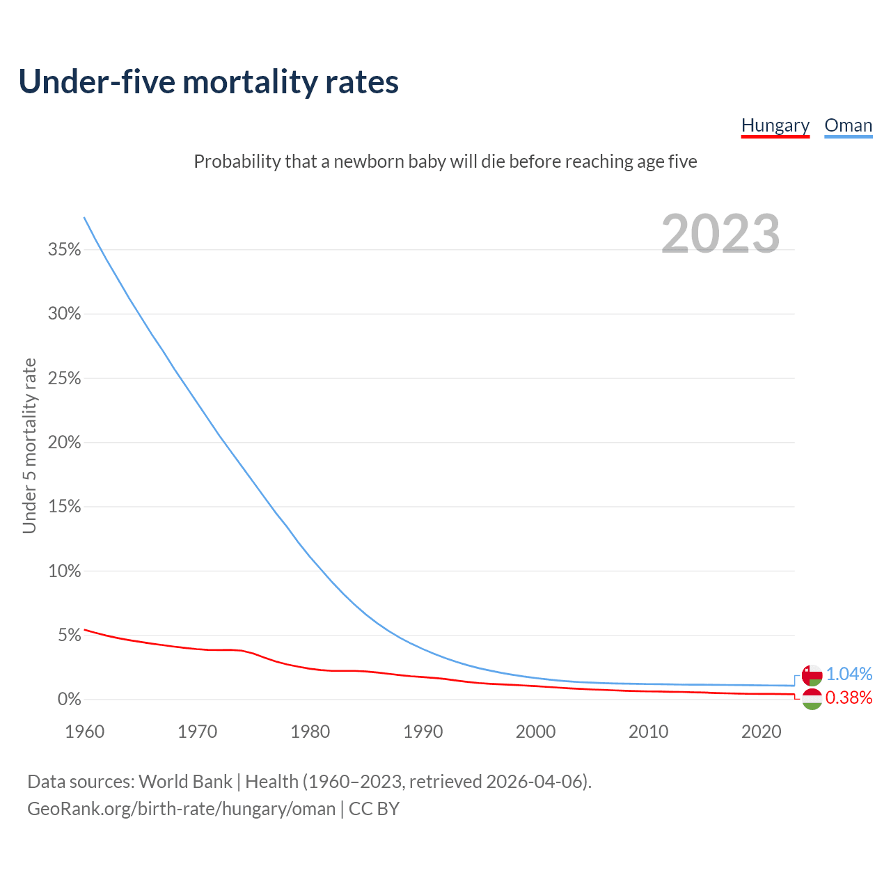 The chance that a newborn baby will die before reaching age five is 0.38% in Hungary and 1.04% in Oman. Above is a chart with historical data on under-five mortality rates.