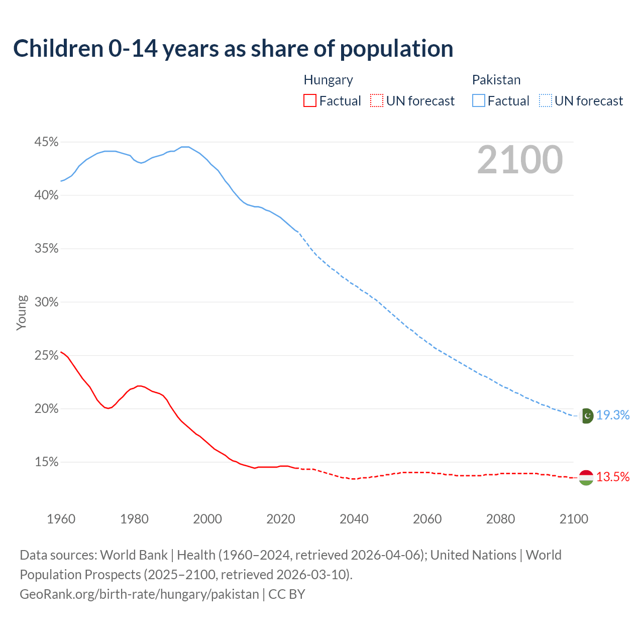 According to the latest available data on birth rates, the fertility rate in Hungary was 1.51 children per woman in 2023, compared to 3.61 in Pakistan in 2023. The replacement level is considered to be 2.1 children per woman.
