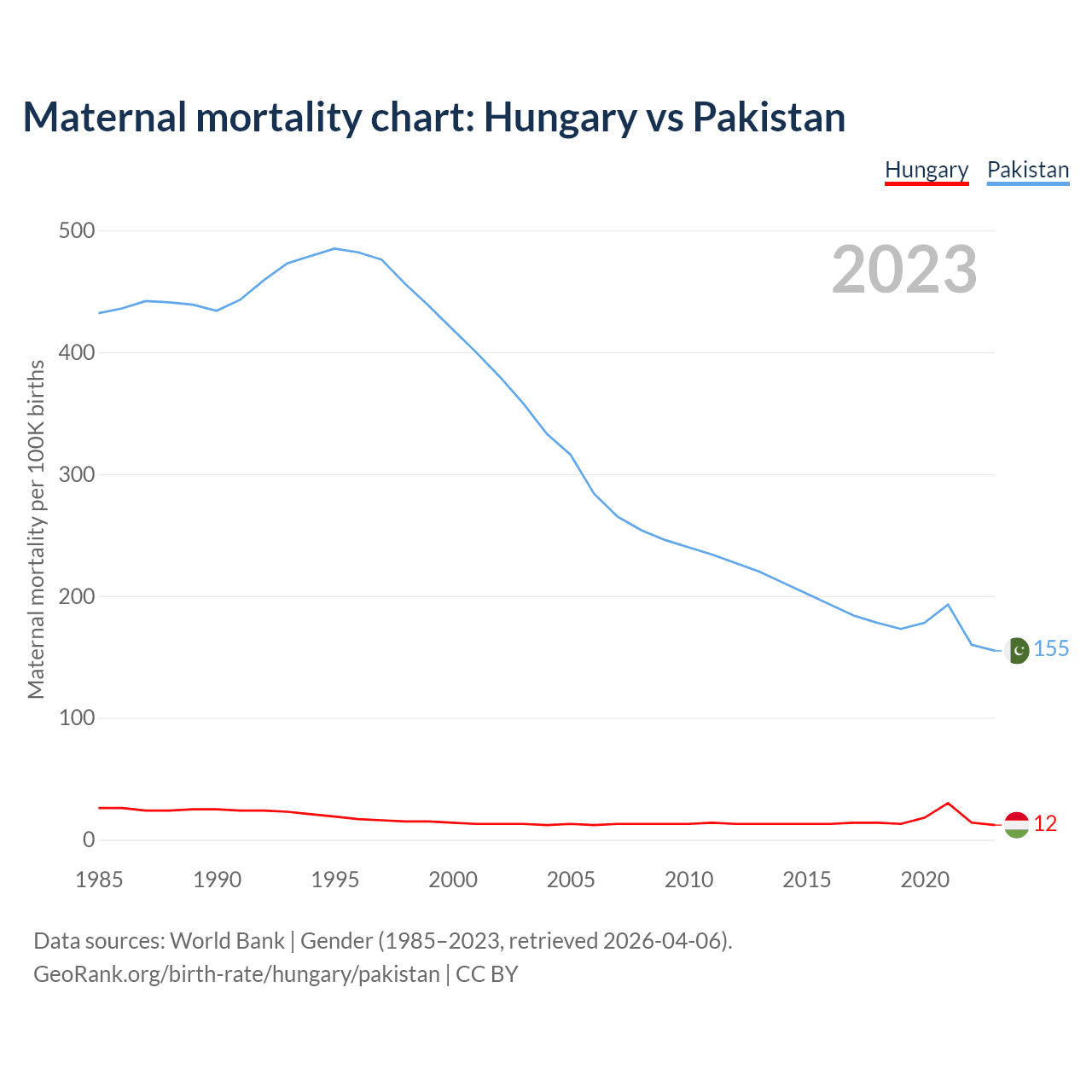 The maternal mortality rate, which is the probability of dying during childbirth or within 42 days of pregnancy termination, is 12 deaths per 100,000 live births in Hungary, compared to 155 deaths in Pakistan.