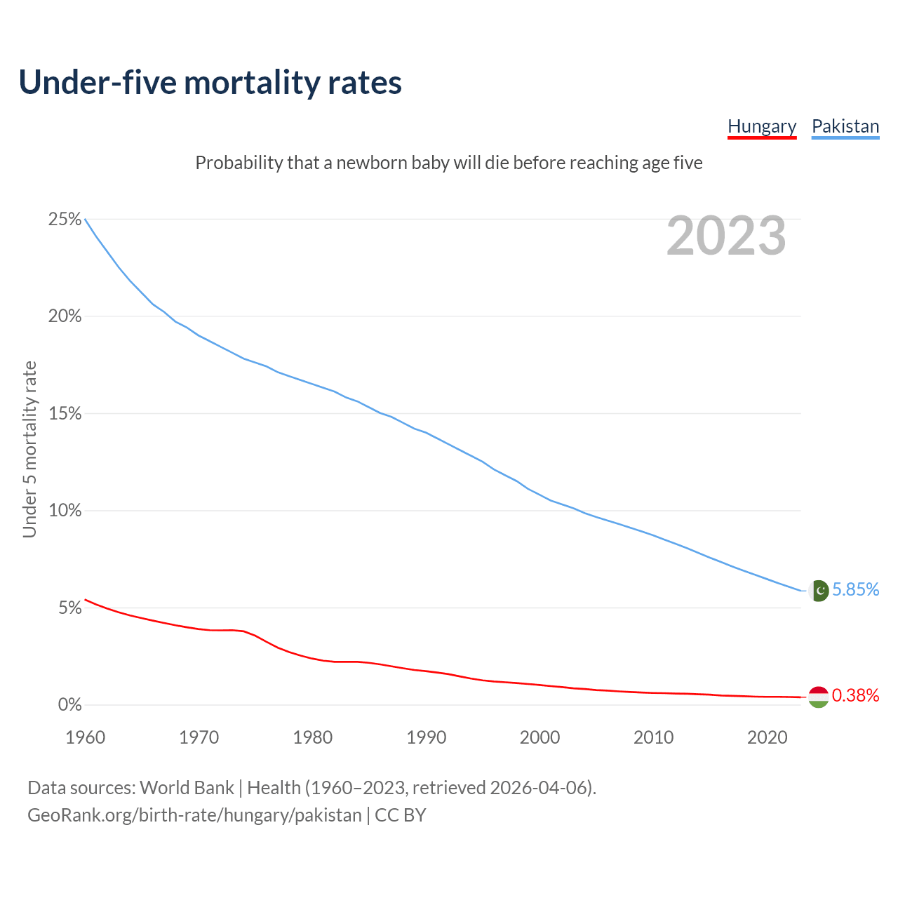 The chance that a newborn baby will die before reaching age five is 0.38% in Hungary and 5.85% in Pakistan. Above is a chart with historical data on under-five mortality rates.