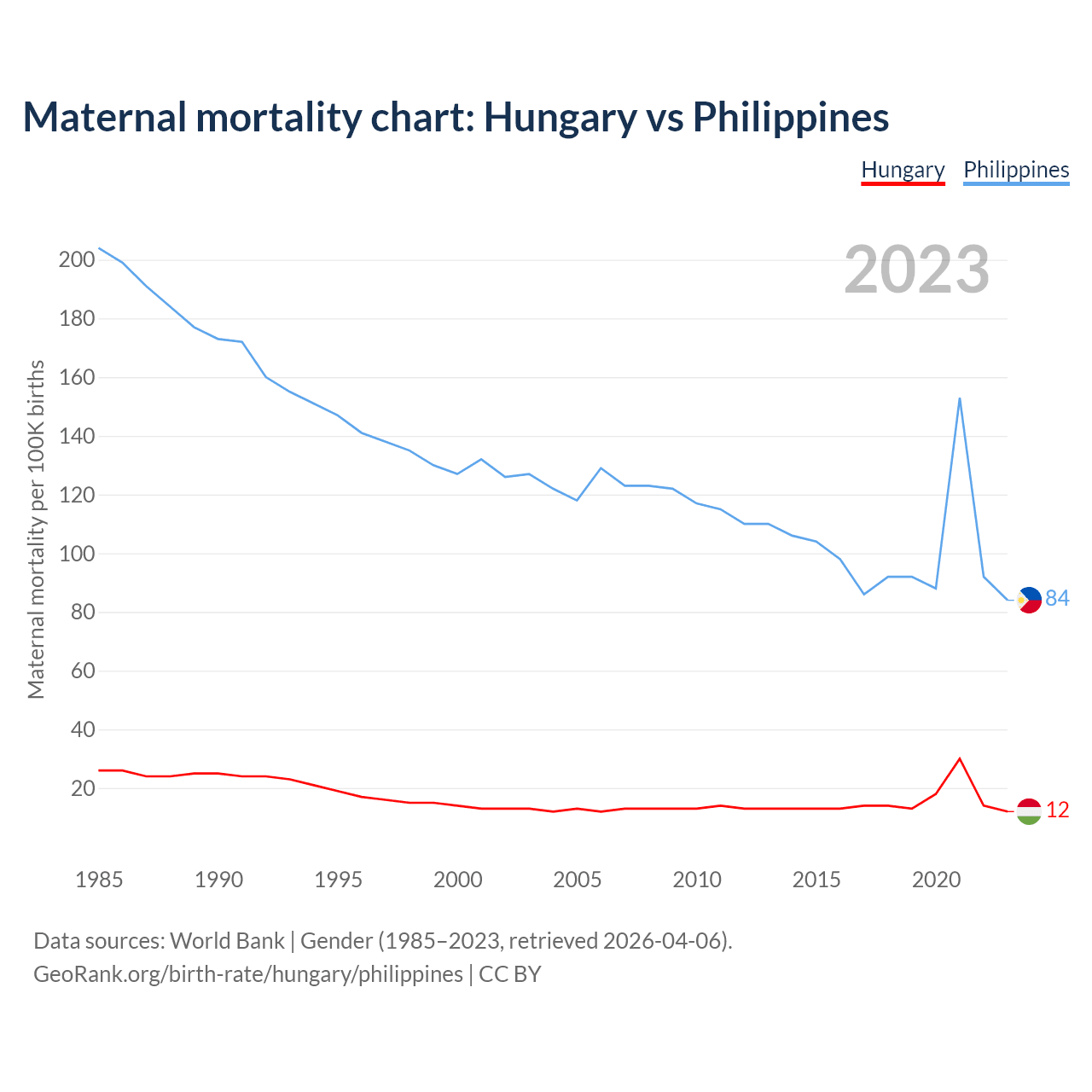 The maternal mortality rate, which is the probability of dying during childbirth or within 42 days of pregnancy termination, is 12 deaths per 100,000 live births in Hungary, compared to 84 deaths in the Philippines.