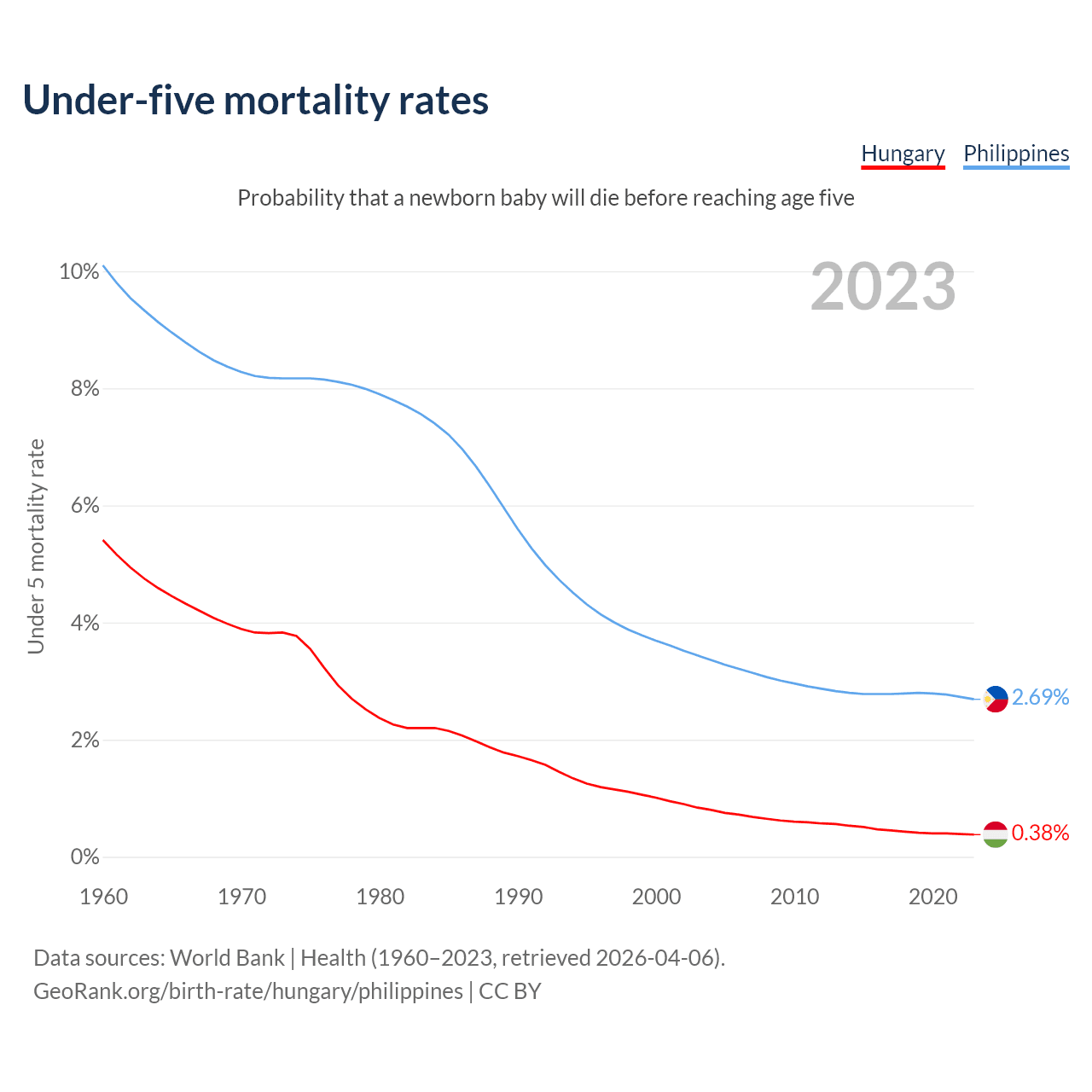The chance that a newborn baby will die before reaching age five is 0.38% in Hungary and 2.69% in the Philippines. Above is a chart with historical data on under-five mortality rates.