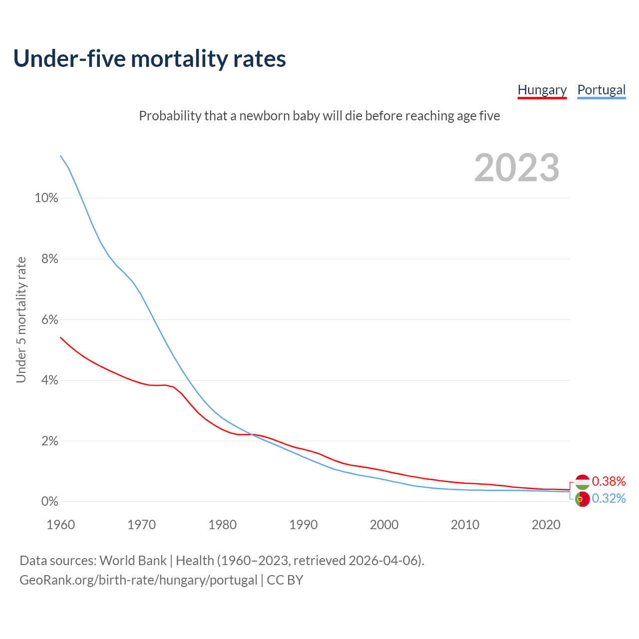 The chance that a newborn baby will die before reaching age five is 0.38% in Hungary and 0.32% in Portugal. Above is a chart with historical data on under-five mortality rates.
