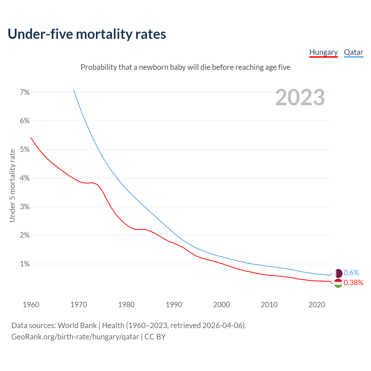 The chance that a newborn baby will die before reaching age five is 0.38% in Hungary and 0.6% in Qatar. Above is a chart with historical data on under-five mortality rates.