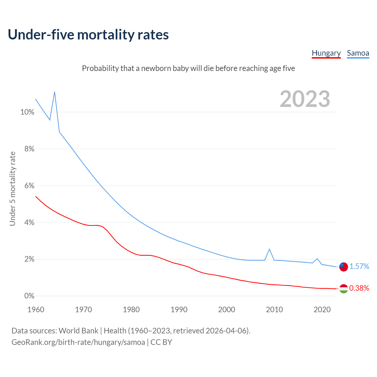The chance that a newborn baby will die before reaching age five is 0.38% in Hungary and 1.57% in Samoa. Above is a chart with historical data on under-five mortality rates.