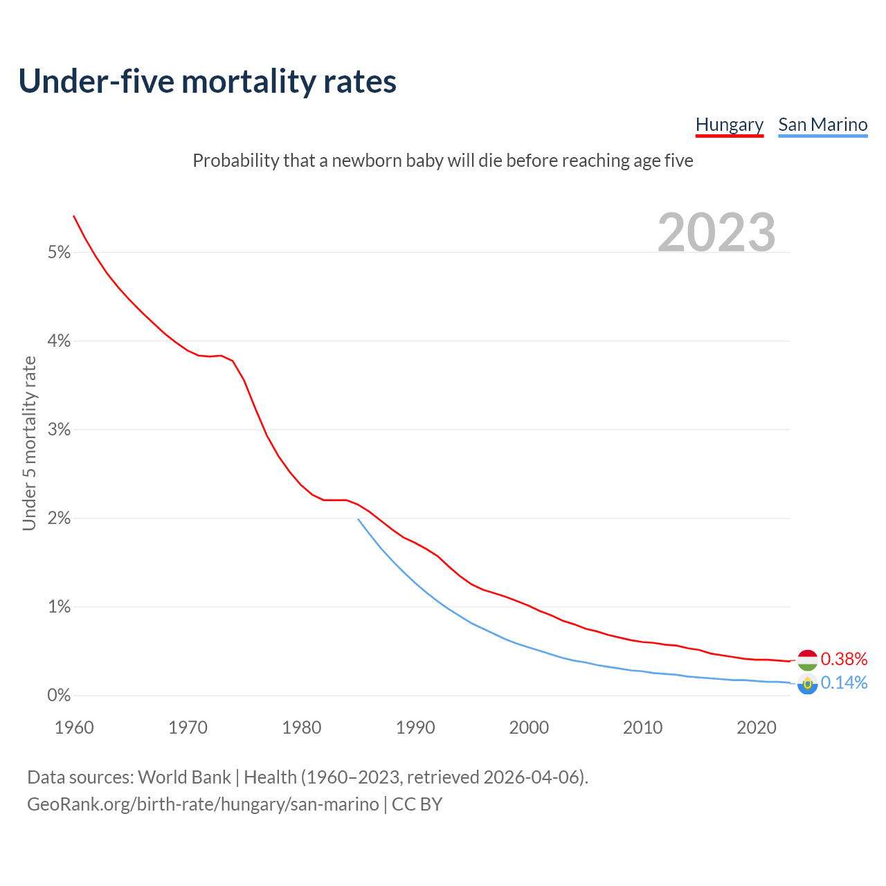 The chance that a newborn baby will die before reaching age five is 0.38% in Hungary and 0.14% in San Marino. Above is a chart with historical data on under-five mortality rates.