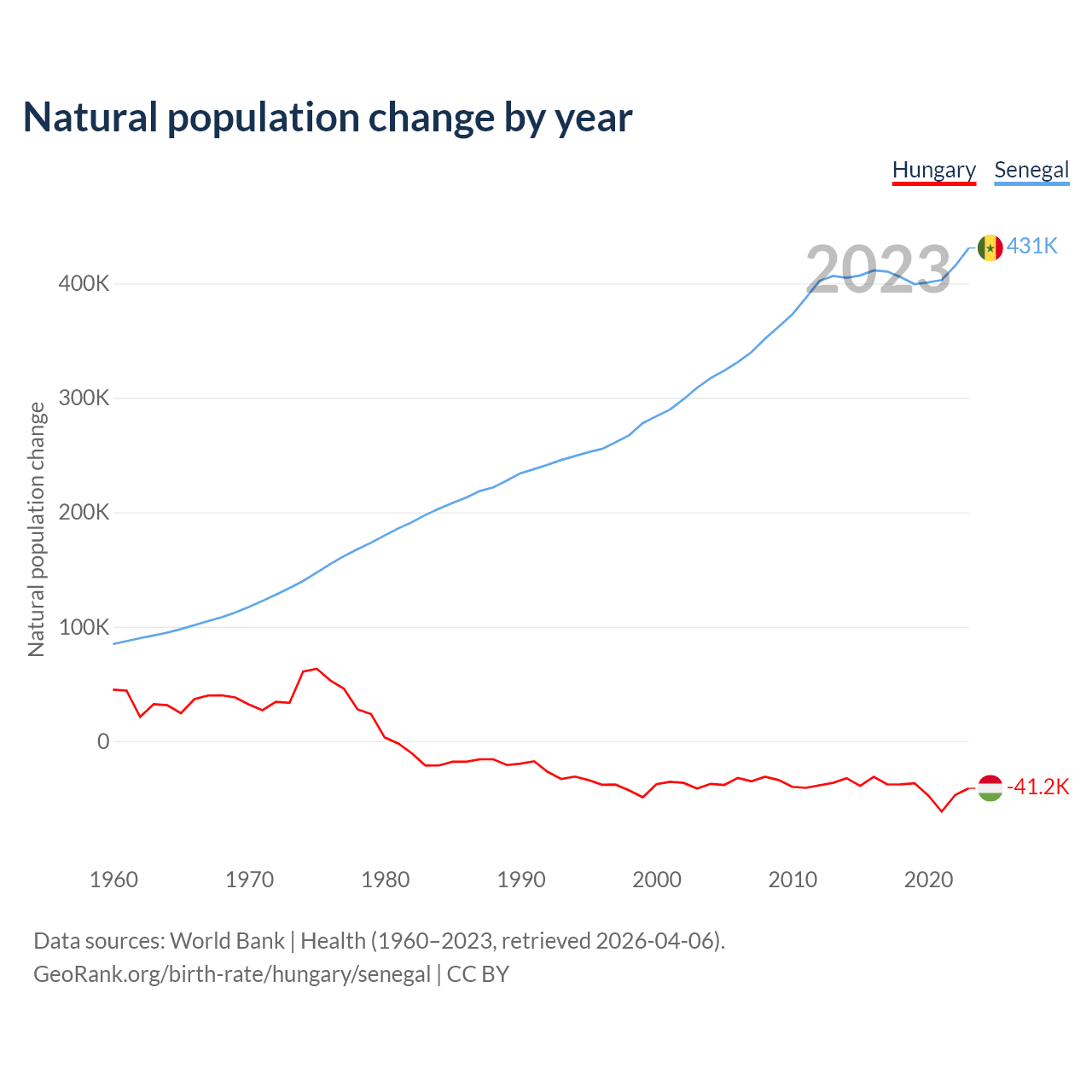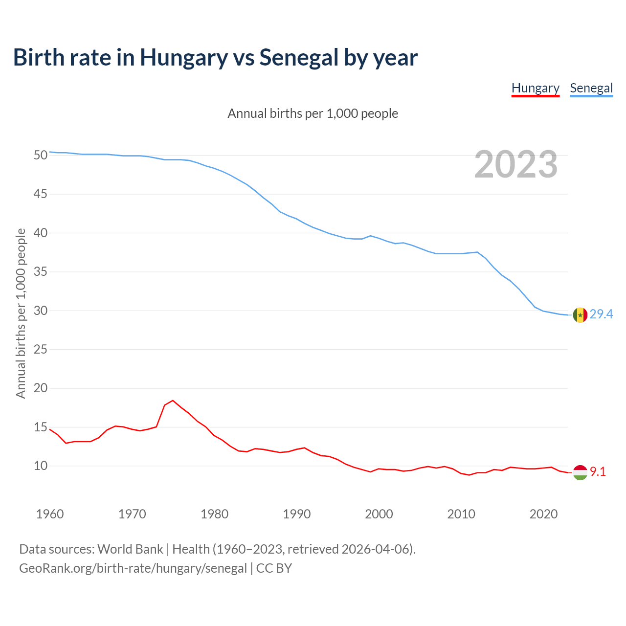 According to the latest available data on birth rates, the fertility rate in Hungary was 1.51 children per woman in 2023, compared to 3.82 in Senegal in 2023. The replacement level is considered to be 2.1 children per woman.