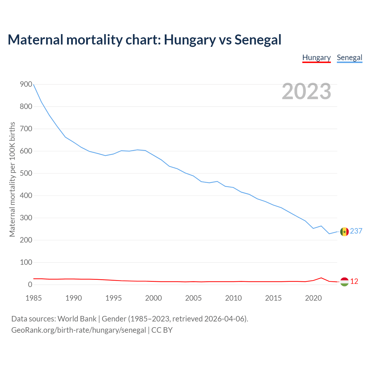 The maternal mortality rate, which is the probability of dying during childbirth or within 42 days of pregnancy termination, is 12 deaths per 100,000 live births in Hungary, compared to 237 deaths in Senegal.