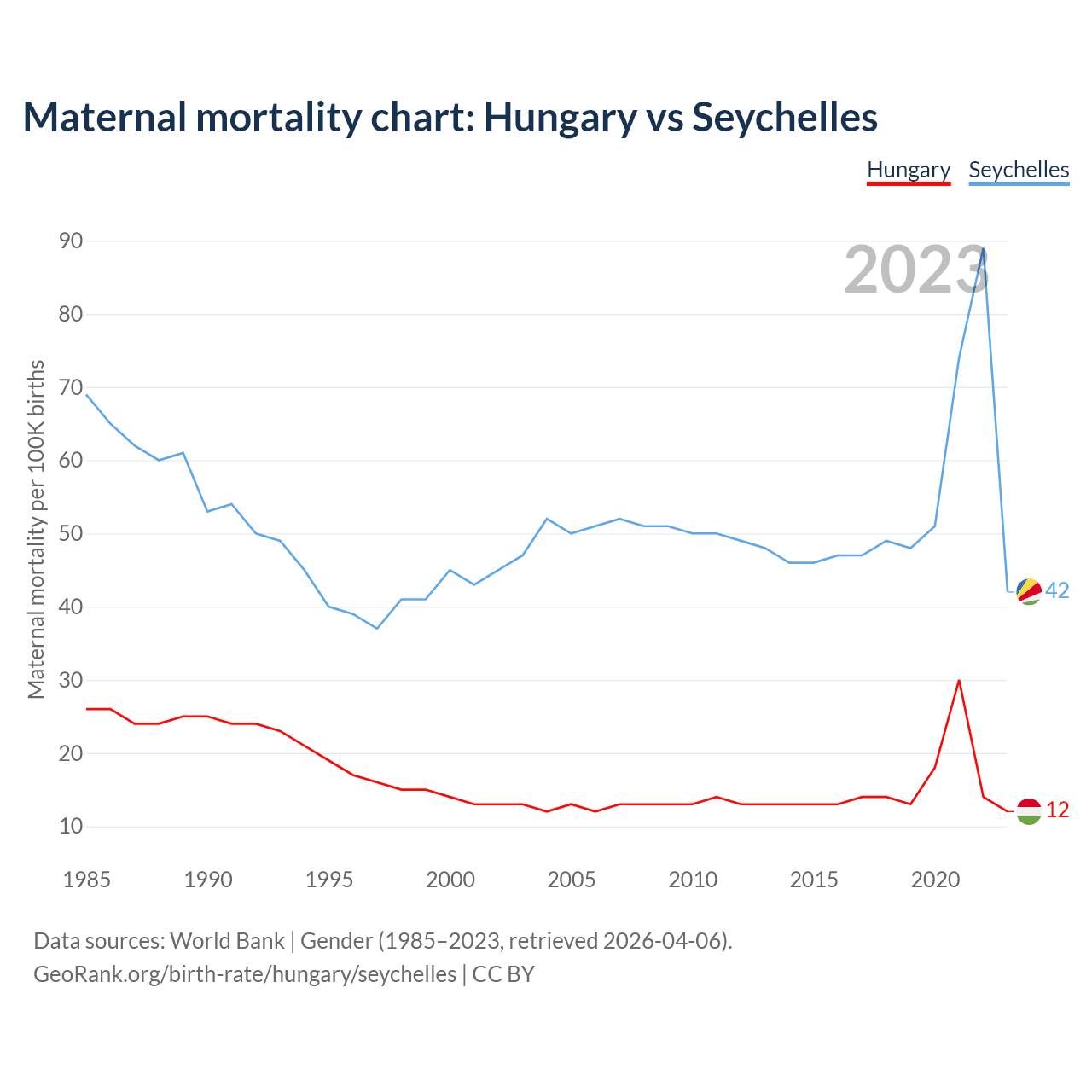 The maternal mortality rate, which is the probability of dying during childbirth or within 42 days of pregnancy termination, is 12 deaths per 100,000 live births in Hungary, compared to 42 deaths in the Seychelles.