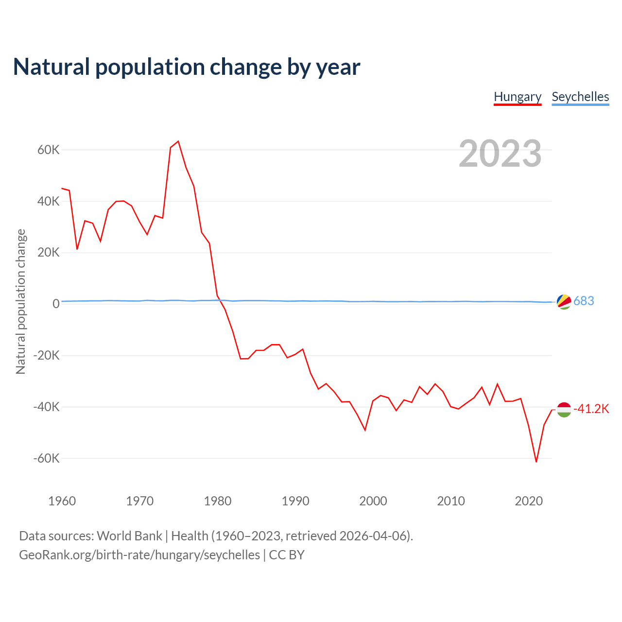 Hungary has an annual birth rate of 9.1 births per 1,000 people, compared to 13 for the Seychelles. The average number of children a woman is expected to have during her lifetime — the fertility rate, is 1.51 in Hungary and 2.02 in the Seychelles — 33.8% difference.
