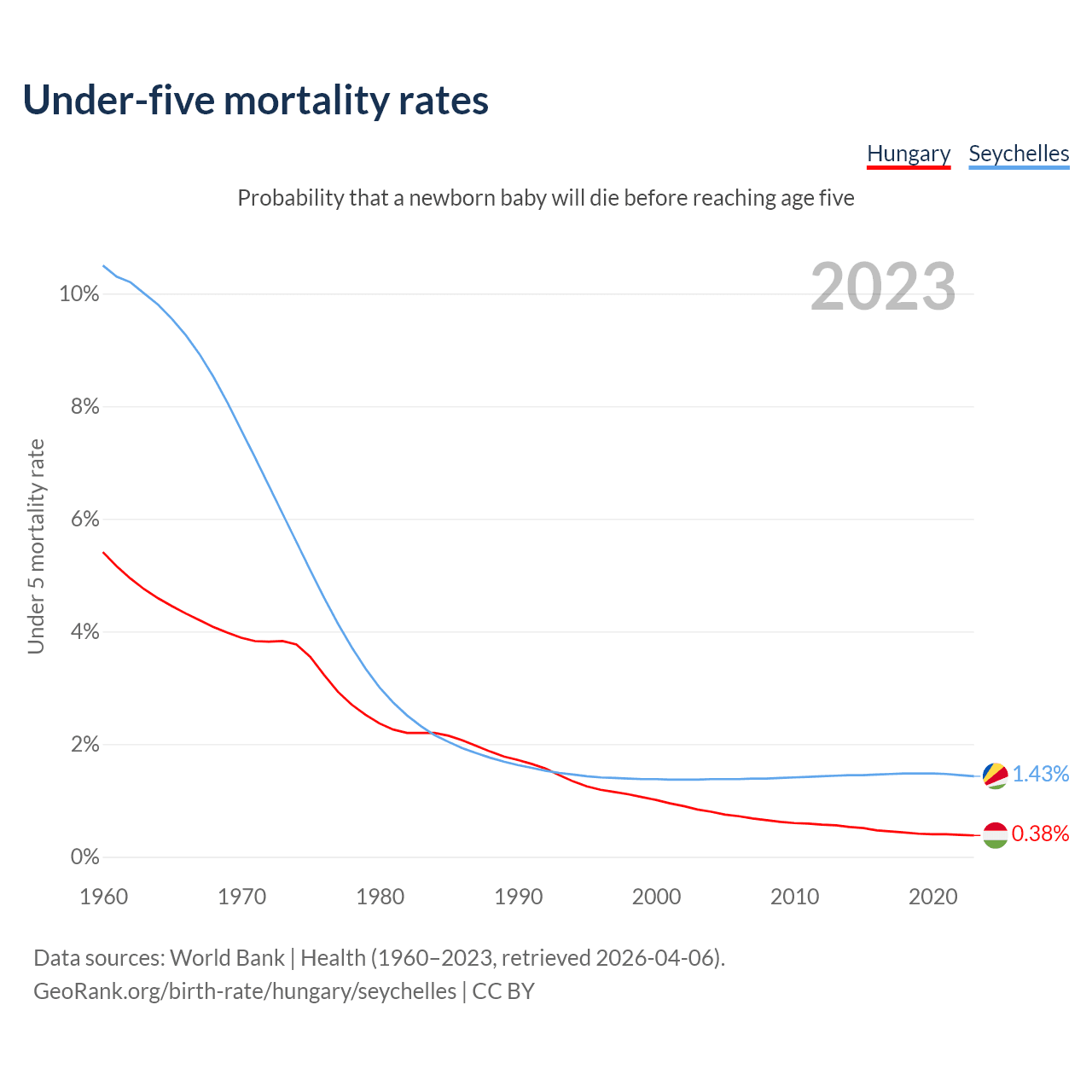 The chance that a newborn baby will die before reaching age five is 0.38% in Hungary and 1.43% in the Seychelles. Above is a chart with historical data on under-five mortality rates.