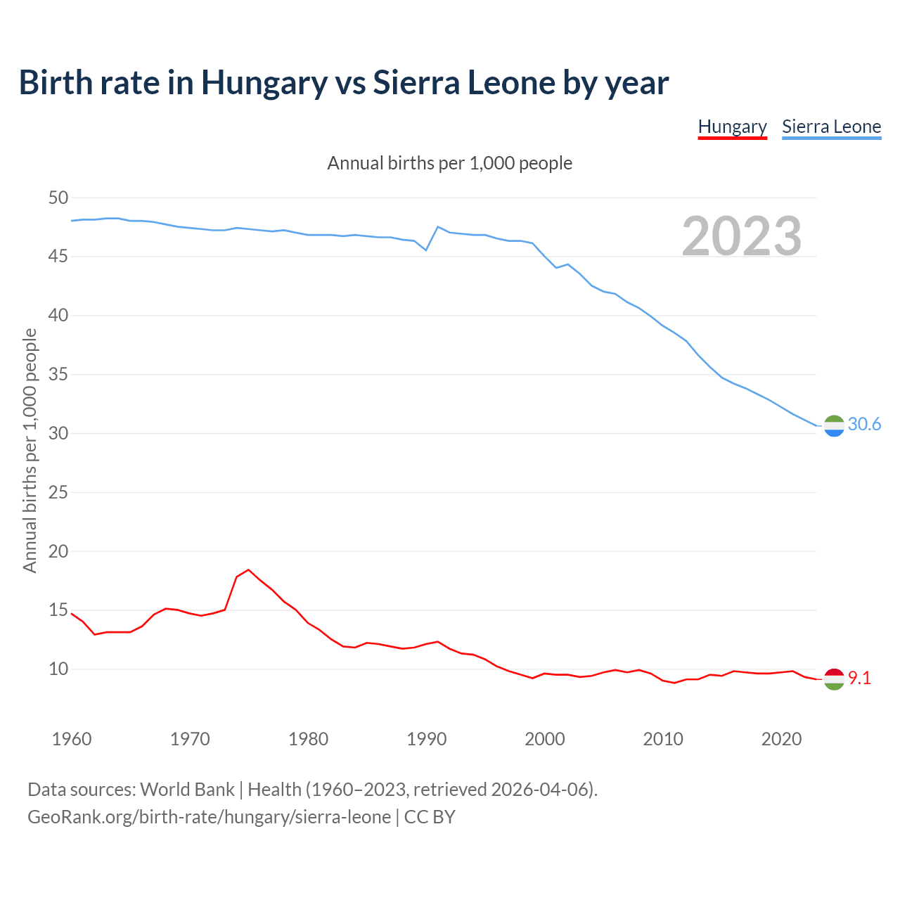 Hungary has an annual birth rate of 9.1 births per 1,000 people, compared to 30.6 for Sierra Leone. The average number of children a woman is expected to have during her lifetime — the fertility rate, is 1.51 in Hungary and 3.79 in Sierra Leone — 151.1% difference.