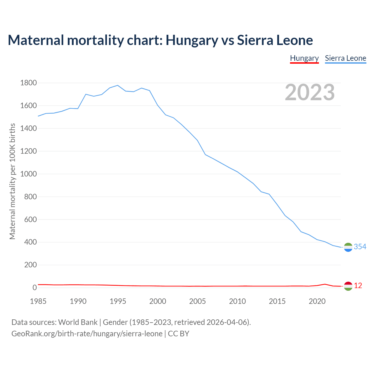 The maternal mortality rate, which is the probability of dying during childbirth or within 42 days of pregnancy termination, is 12 deaths per 100,000 live births in Hungary, compared to 354 deaths in Sierra Leone.