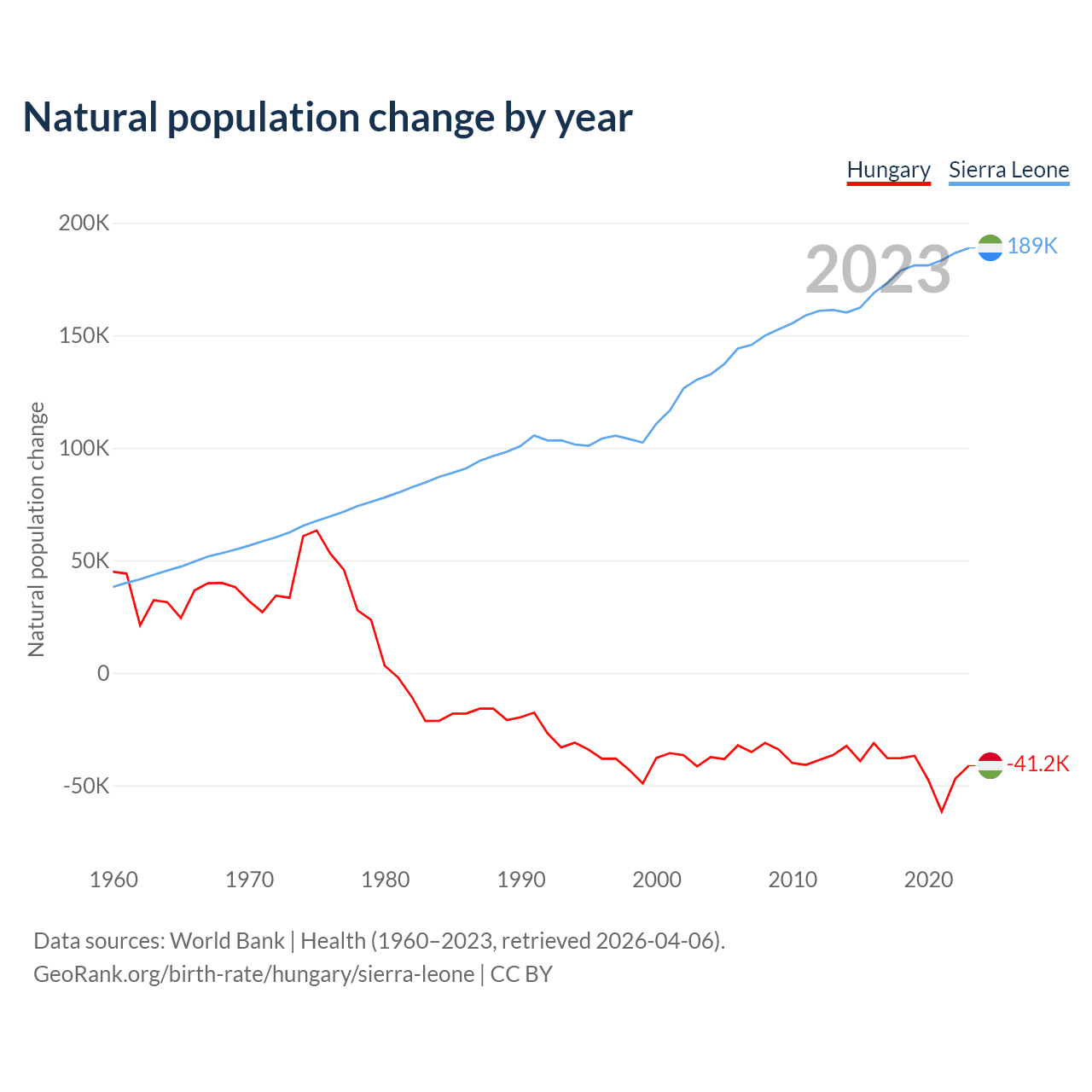 According to the latest available data on birth rates, the fertility rate in Hungary was 1.51 children per woman in 2023, compared to 3.79 in Sierra Leone in 2023. The replacement level is considered to be 2.1 children per woman.