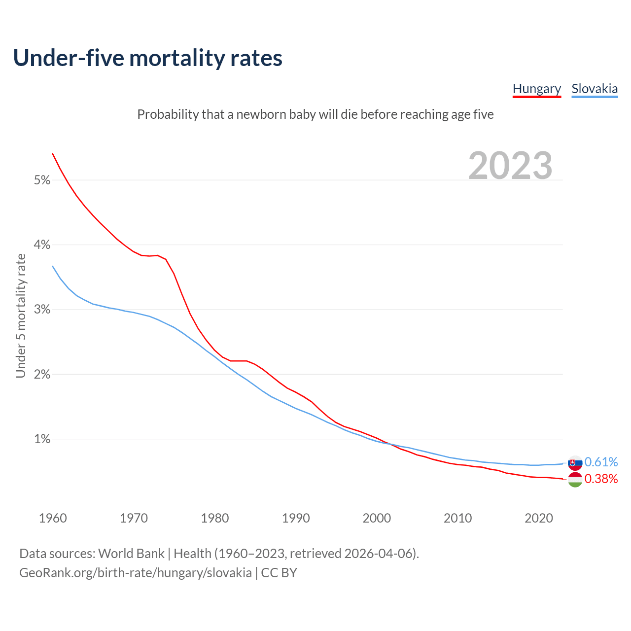 The chance that a newborn baby will die before reaching age five is 0.38% in Hungary and 0.61% in Slovakia. Above is a chart with historical data on under-five mortality rates.