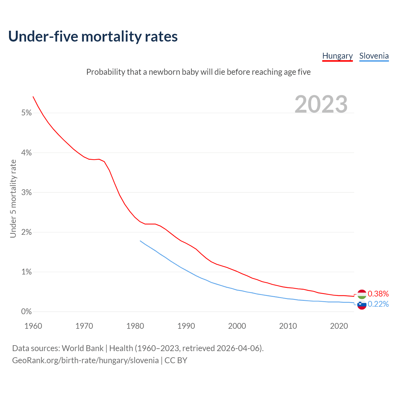 The chance that a newborn baby will die before reaching age five is 0.38% in Hungary and 0.22% in Slovenia. Above is a chart with historical data on under-five mortality rates.