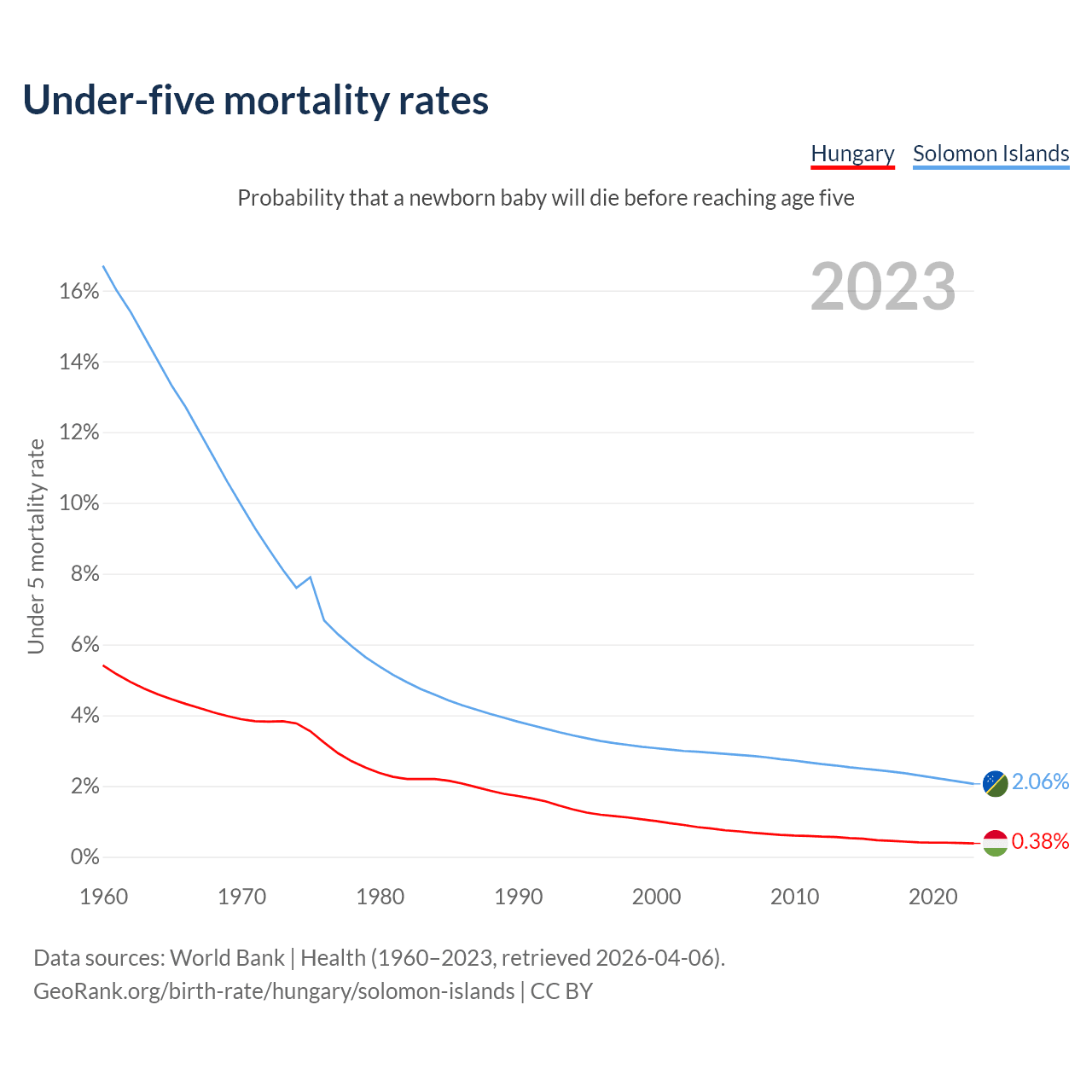 The chance that a newborn baby will die before reaching age five is 0.38% in Hungary and 2.06% in the Solomon Islands. Above is a chart with historical data on under-five mortality rates.