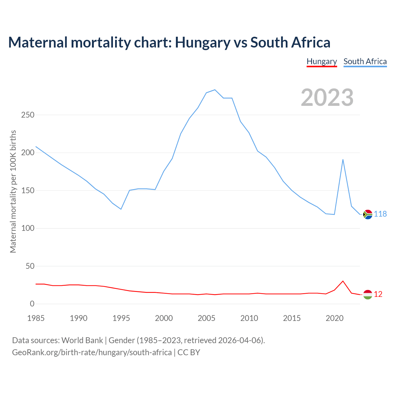 The maternal mortality rate, which is the probability of dying during childbirth or within 42 days of pregnancy termination, is 12 deaths per 100,000 live births in Hungary, compared to 118 deaths in South Africa.