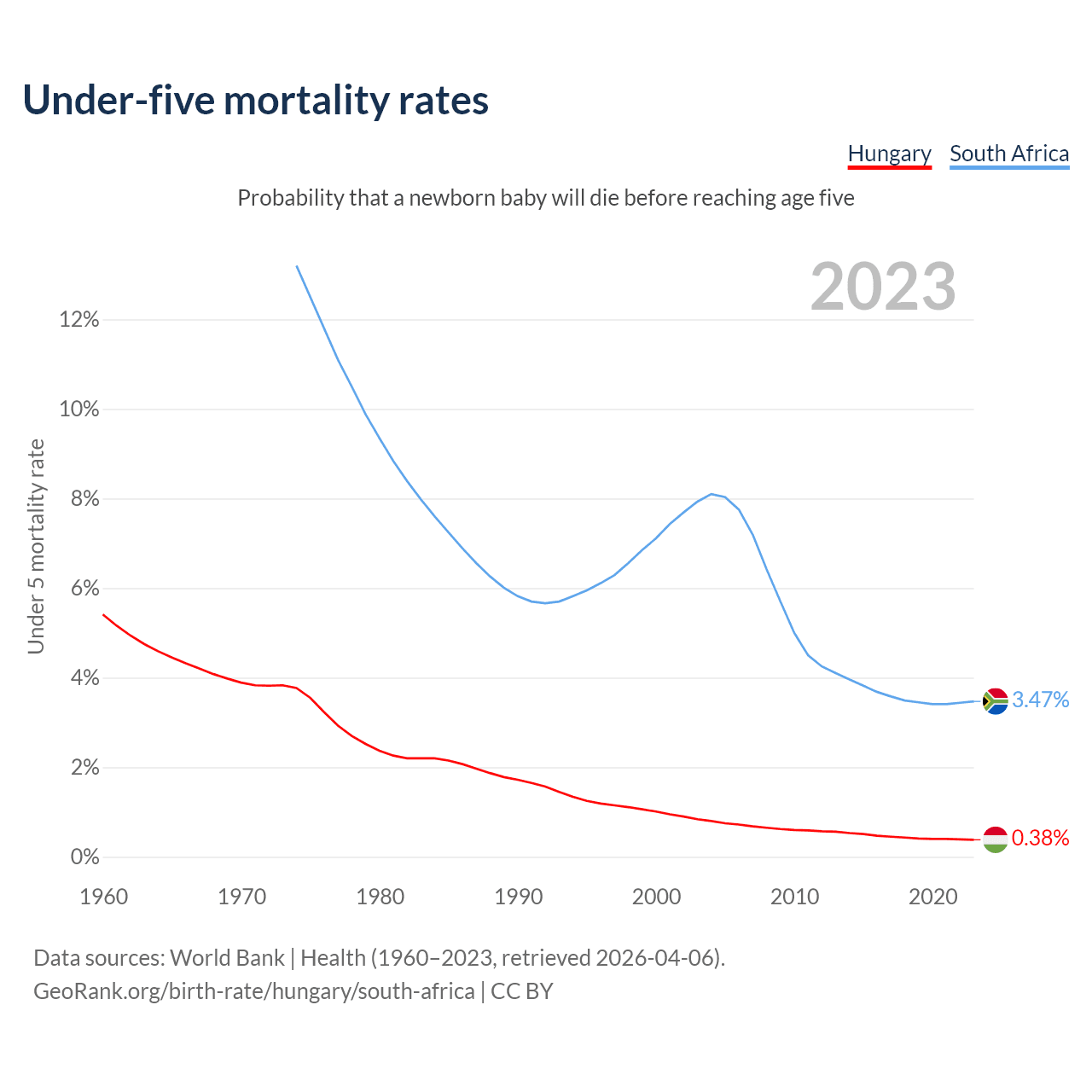 The chance that a newborn baby will die before reaching age five is 0.38% in Hungary and 3.47% in South Africa. Above is a chart with historical data on under-five mortality rates.