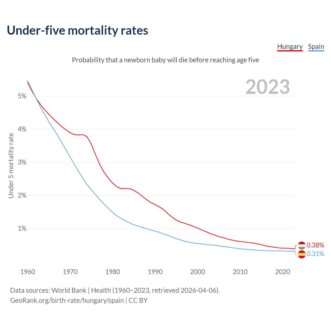 The chance that a newborn baby will die before reaching age five is 0.38% in Hungary and 0.31% in Spain. Above is a chart with historical data on under-five mortality rates.