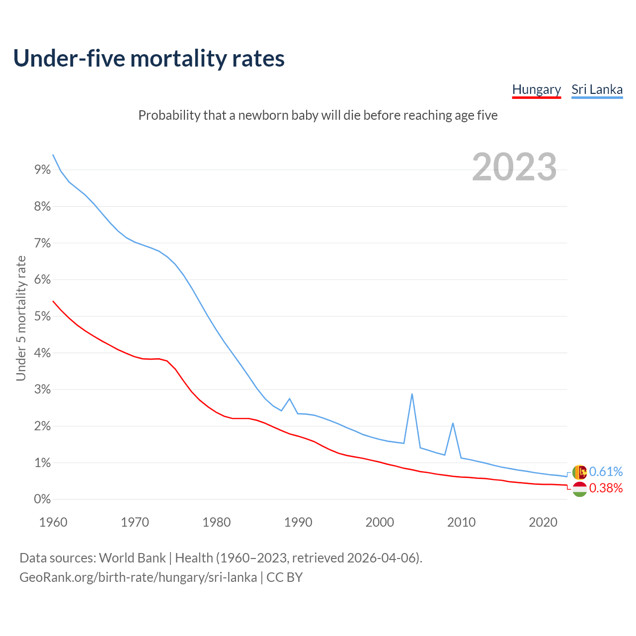 The chance that a newborn baby will die before reaching age five is 0.38% in Hungary and 0.61% in Sri Lanka. Above is a chart with historical data on under-five mortality rates.
